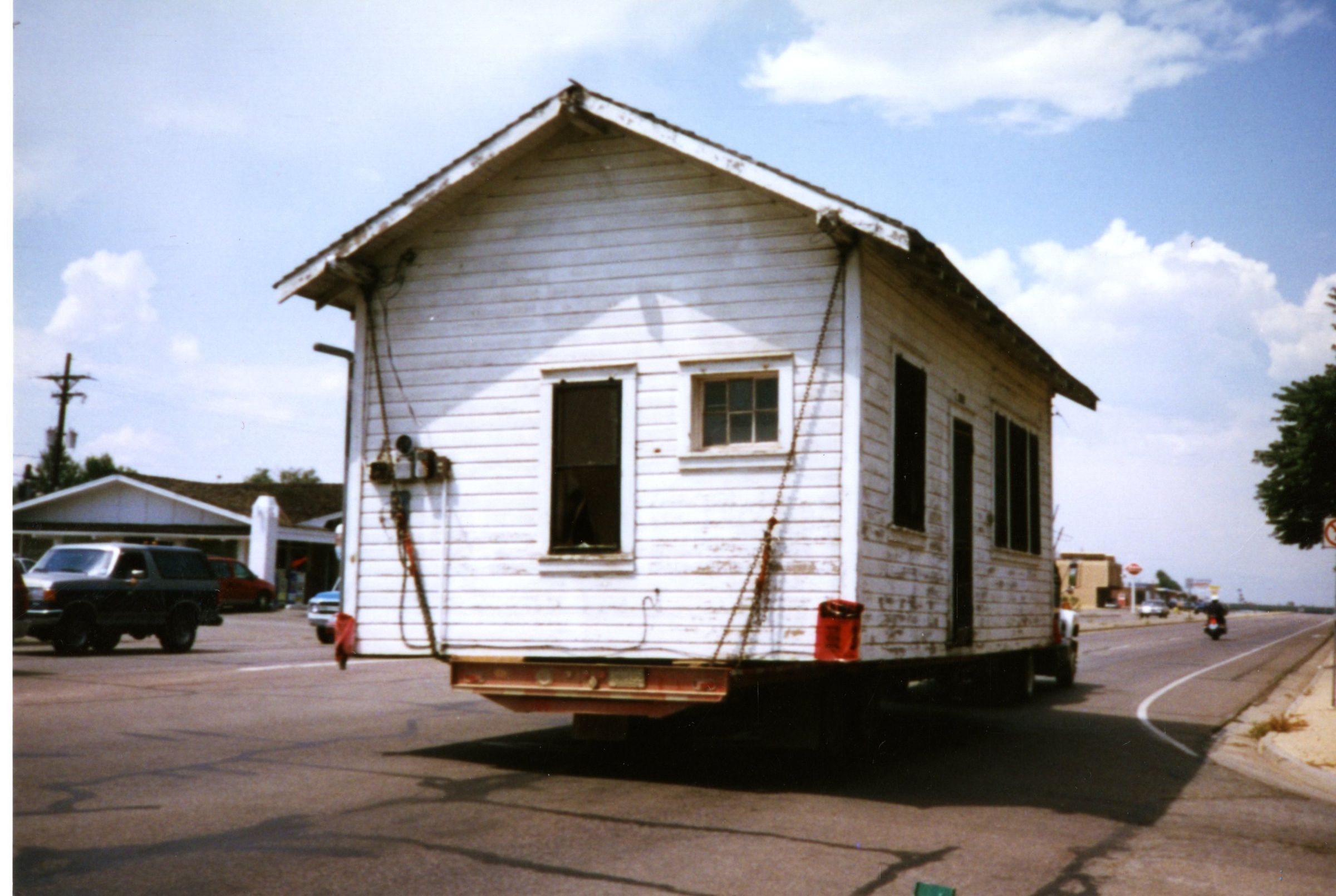 Moving the Honey House on truck and trailer down street. Rear view.