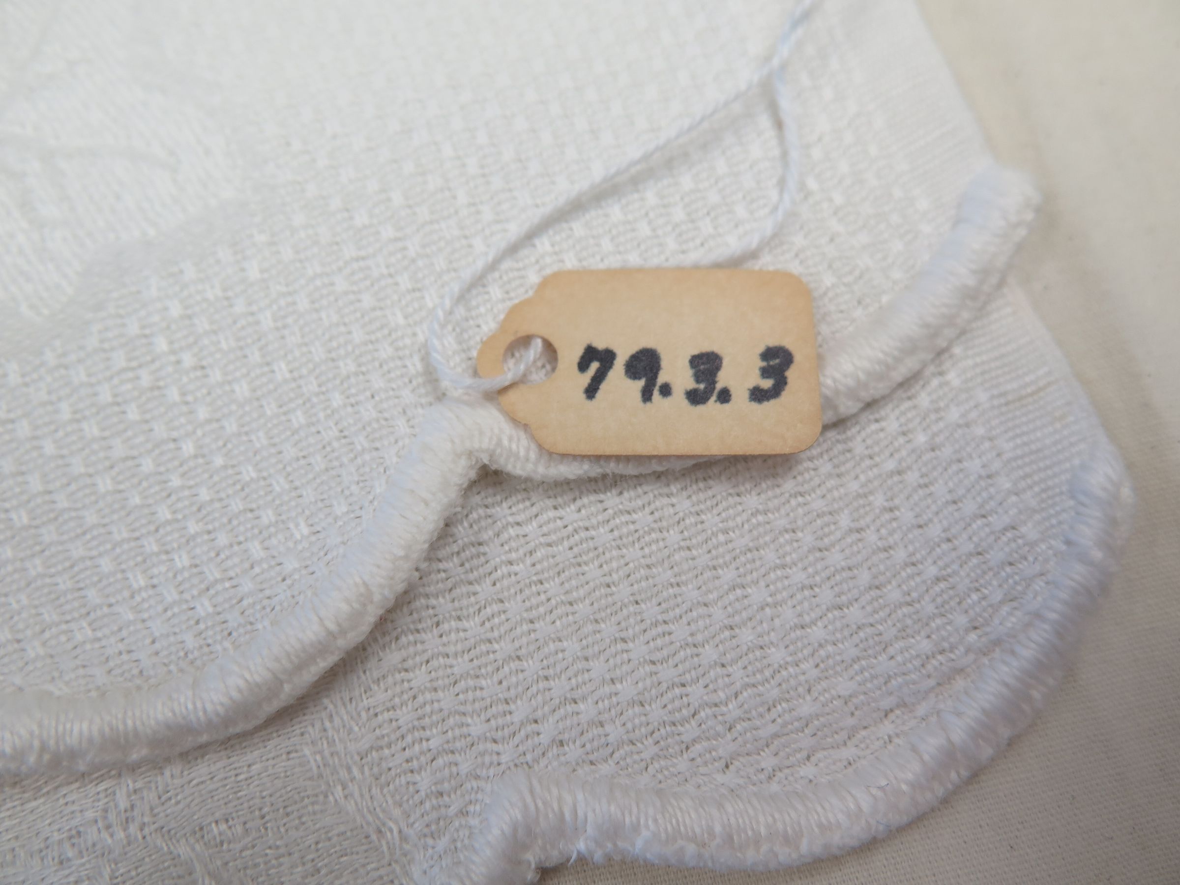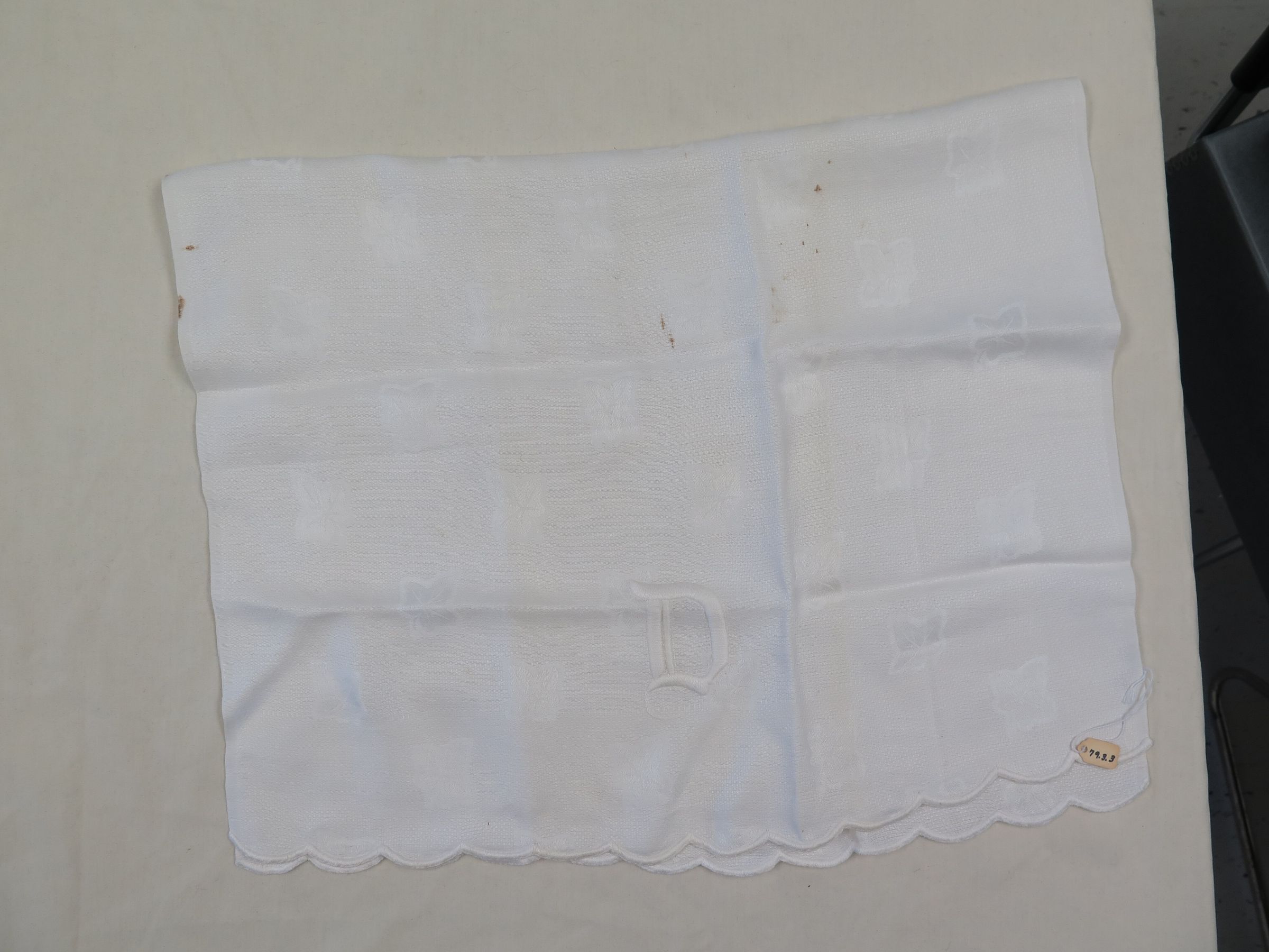 White towel or table runner made of cotton or linen with embroidered "D" initial. Meant to be used with the commode she donated (1978.4.7). Towel measures 21" (w) x 32" (l).