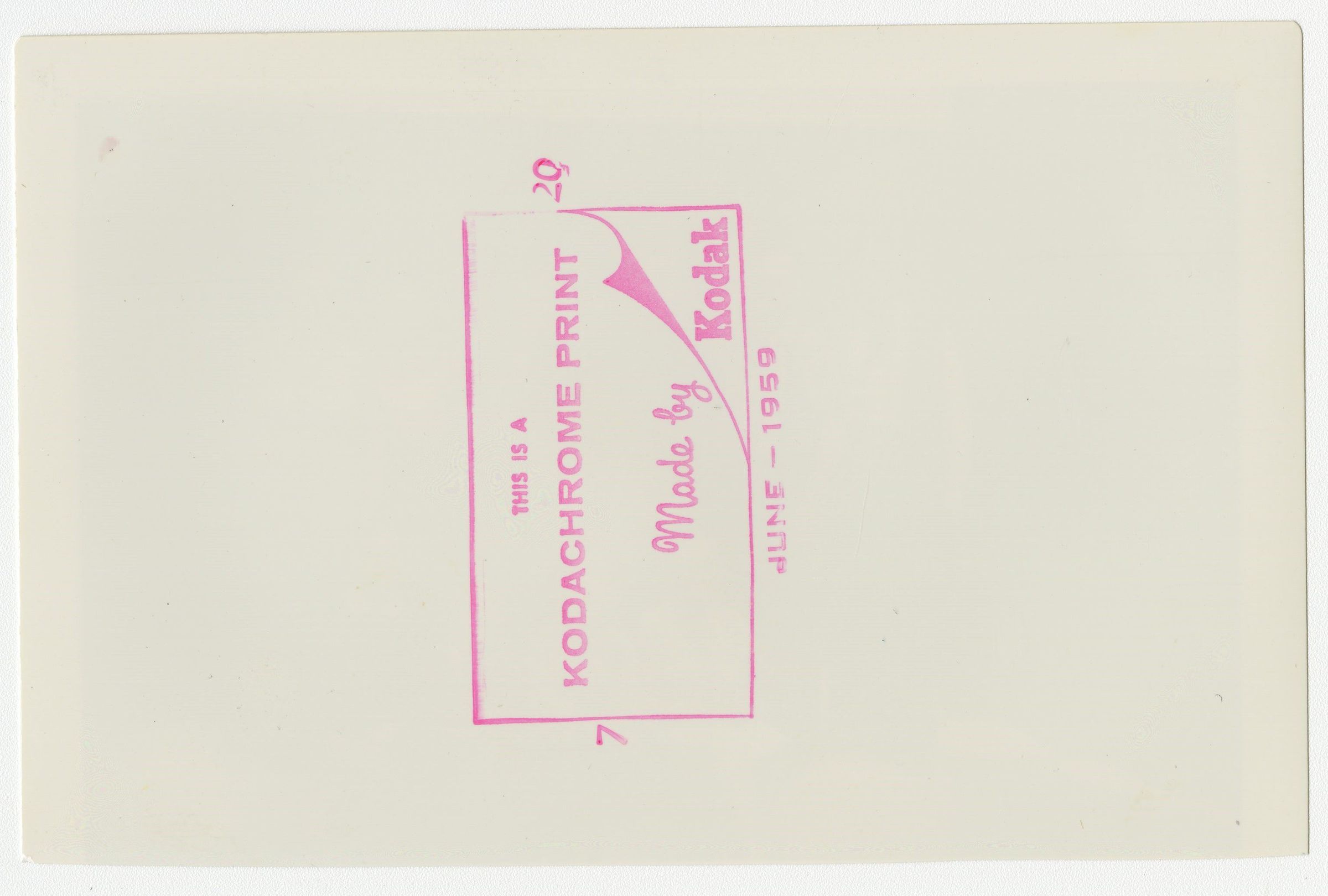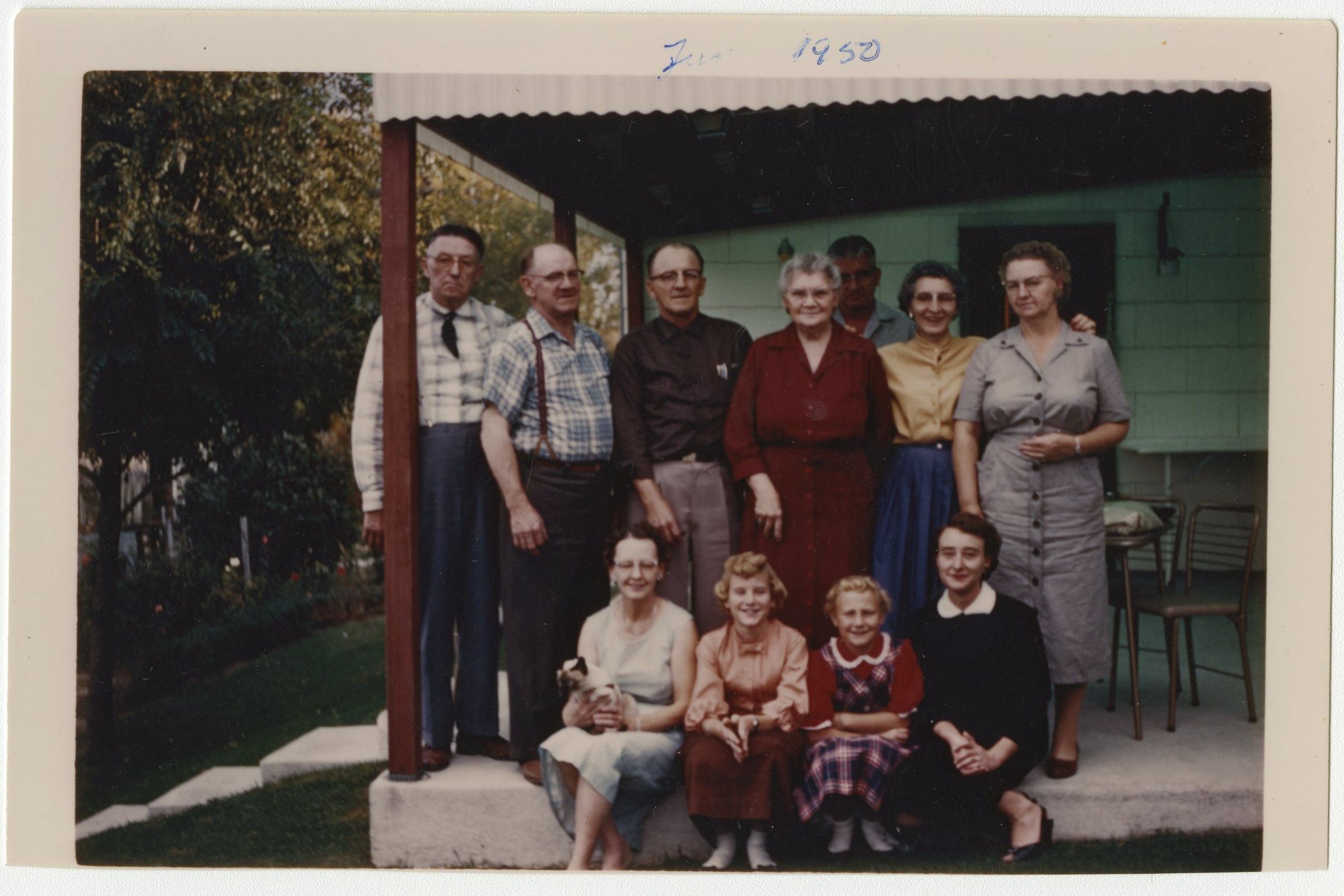 Color photograph of various members of the Brunner family. The woman furthest to the right is probably Lib Brunner. Handwritten on the upper edge of the photograph is Jun 1950. Photograph was developed in June of 1959.
