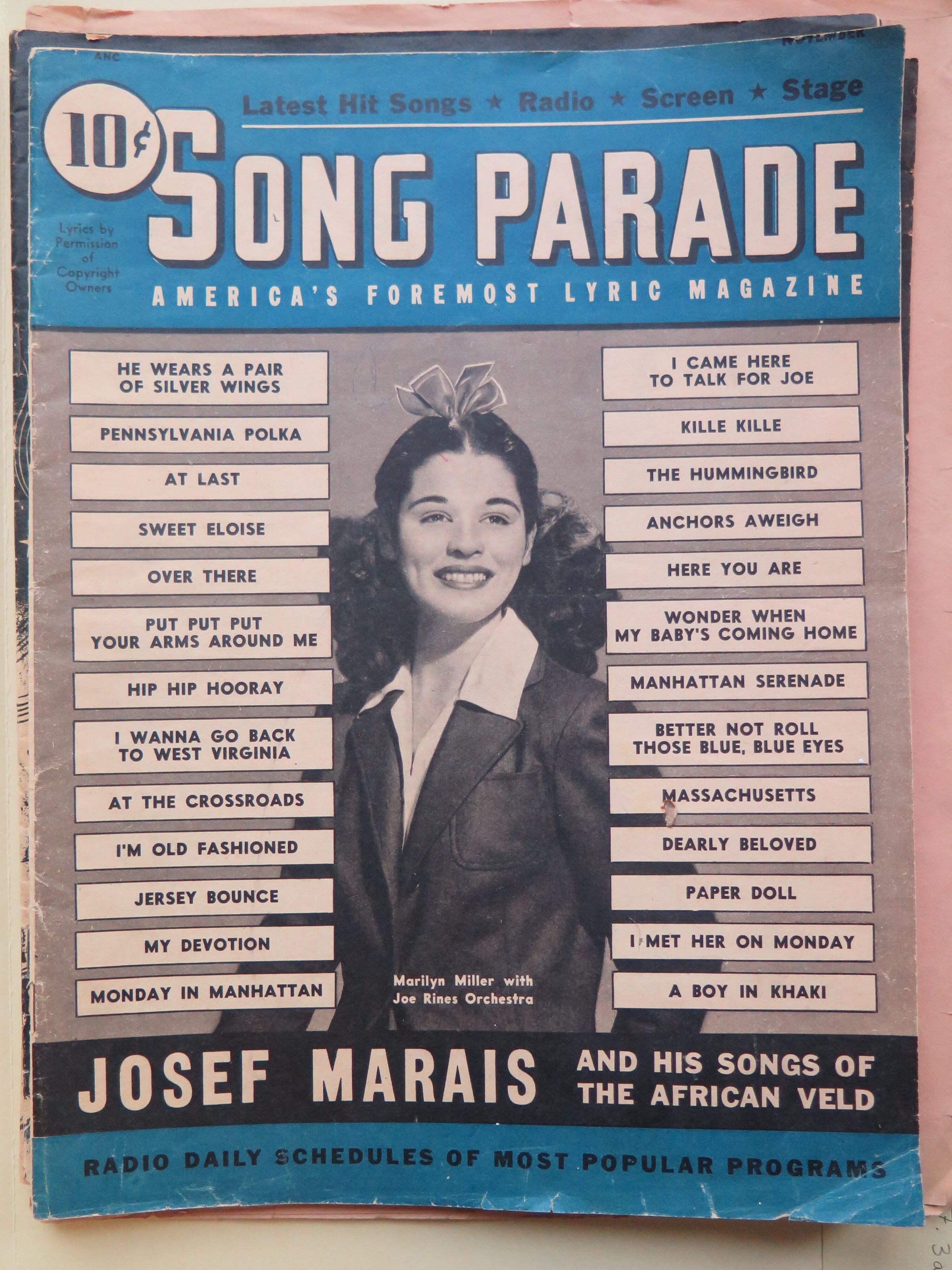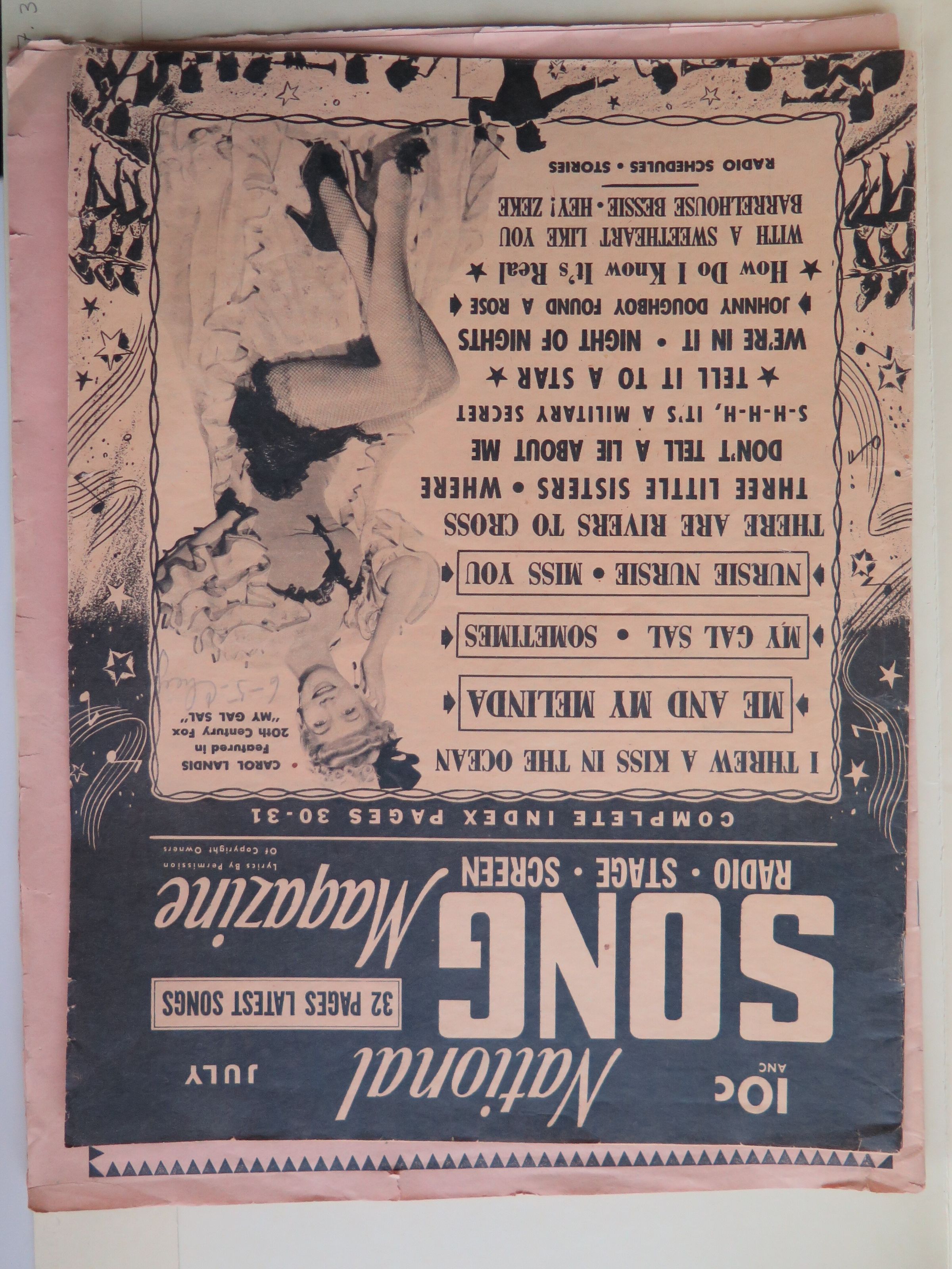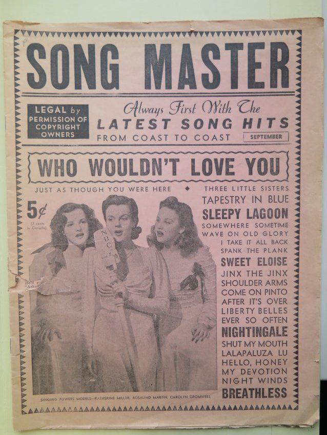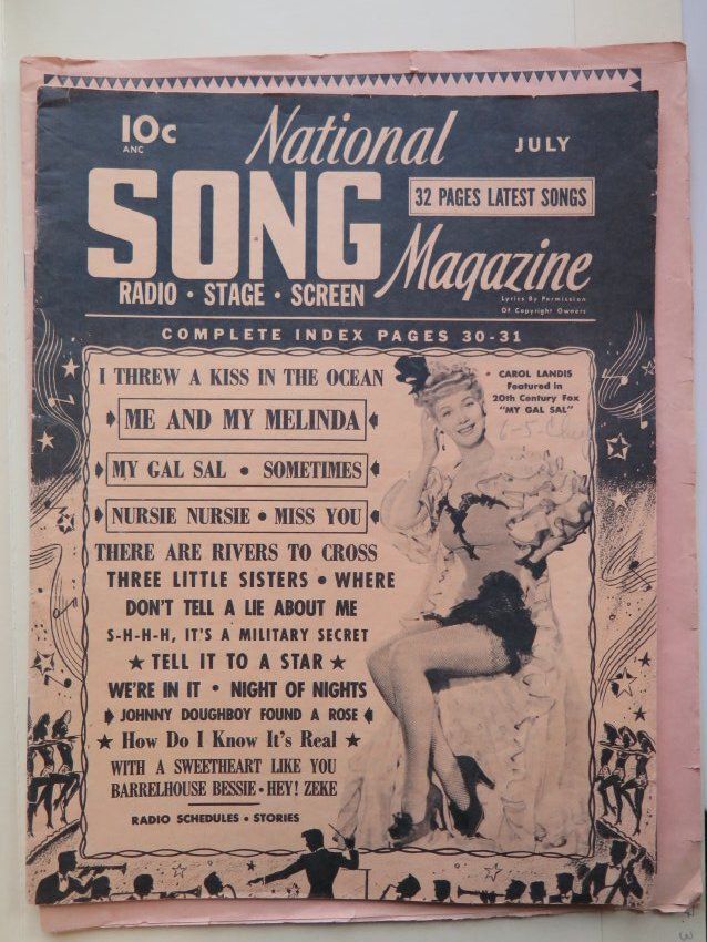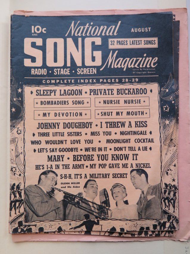 4 song magazines from 1941-1942. Magazines have 32 pages of songs. They are browned with age. The bottom right corner is folded on 2 magazines. One magazine is faded and very ripped.