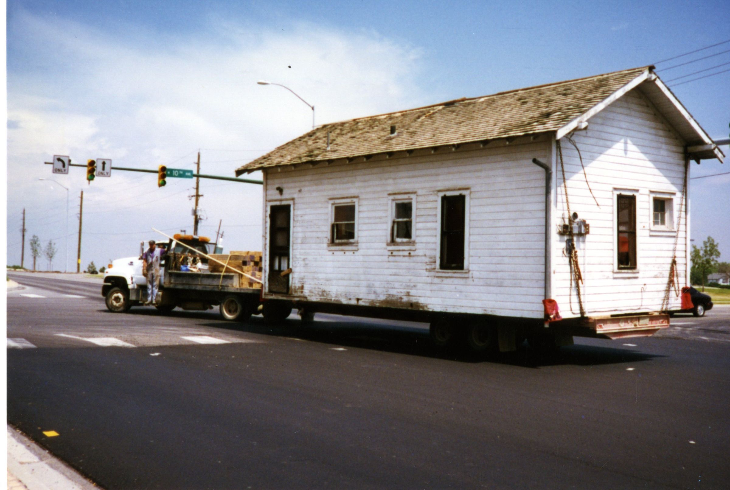Moving the Honey House on truck and trailer turning down 10 th street. Rear side view.