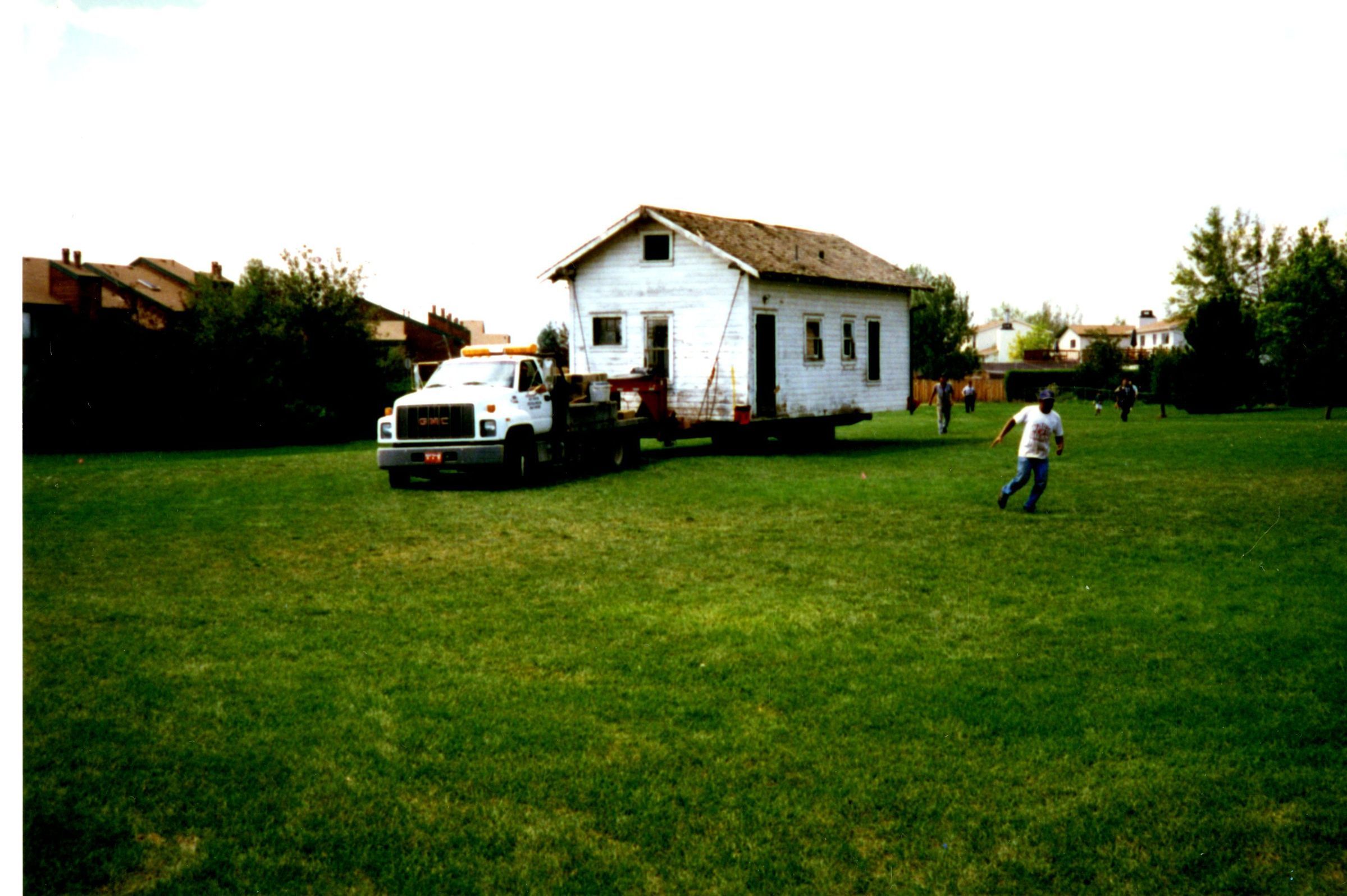 Moving the Honey House on truck at Zang Spur Park. Front side view.