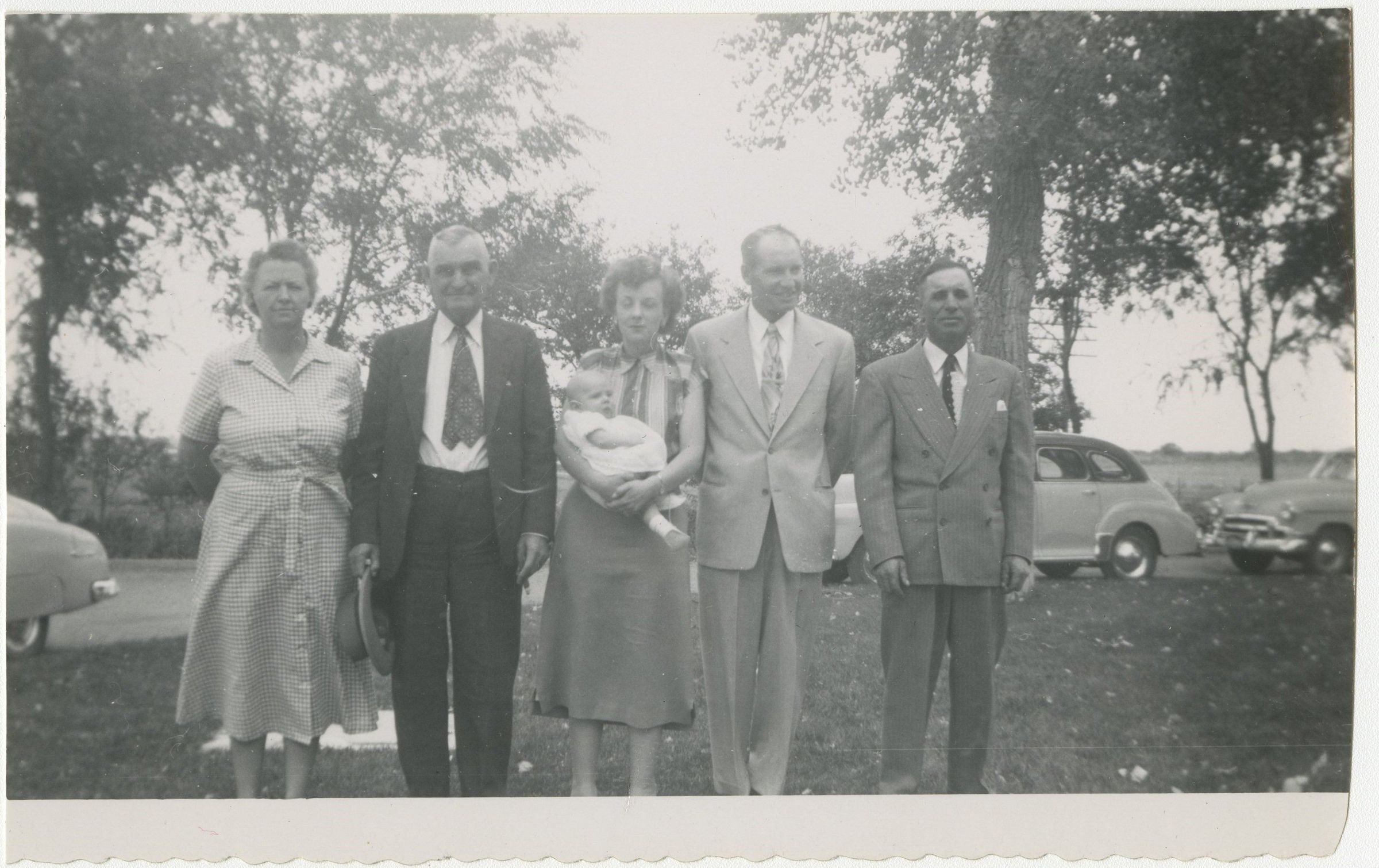Black and white photograph of six people in the Brunner family. From left to right the members are Lib Brunner, Albert Brunner, Ila Brunner holding a child, Gilbert Brunner, and Lester C. Brunner.