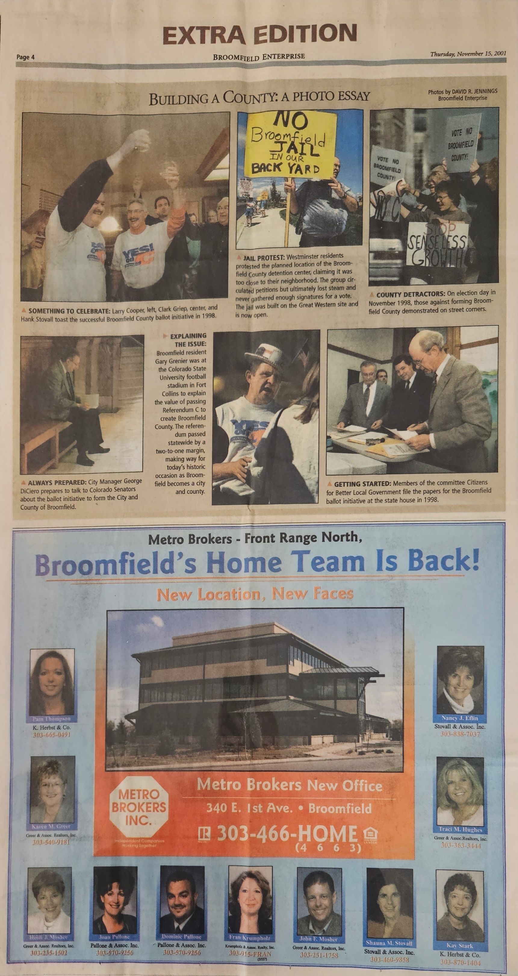 Item is an Extra Edition of the Thursday Broomfield Enterprise from November 15, 2001, titled, "Welcome to Broomfield County." The paper is 4 pages long and printed on brown paper, but it includes colored photos of Broomfield workers and community members. Inside the newspaper, there are articles about the building of Broomfield as a county and community, with articles about finances and social issues. There is also a photo essay capturing the creation of Broomfield as a county and a miniature article about the history of the area.Lexicon