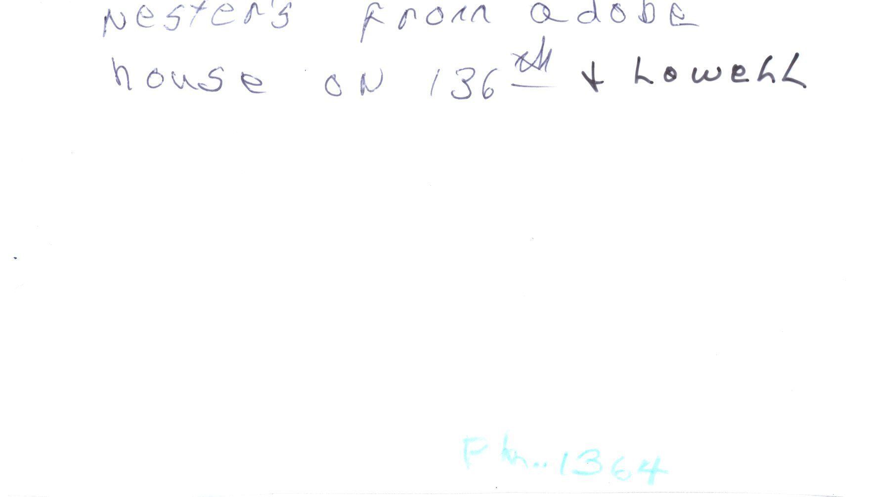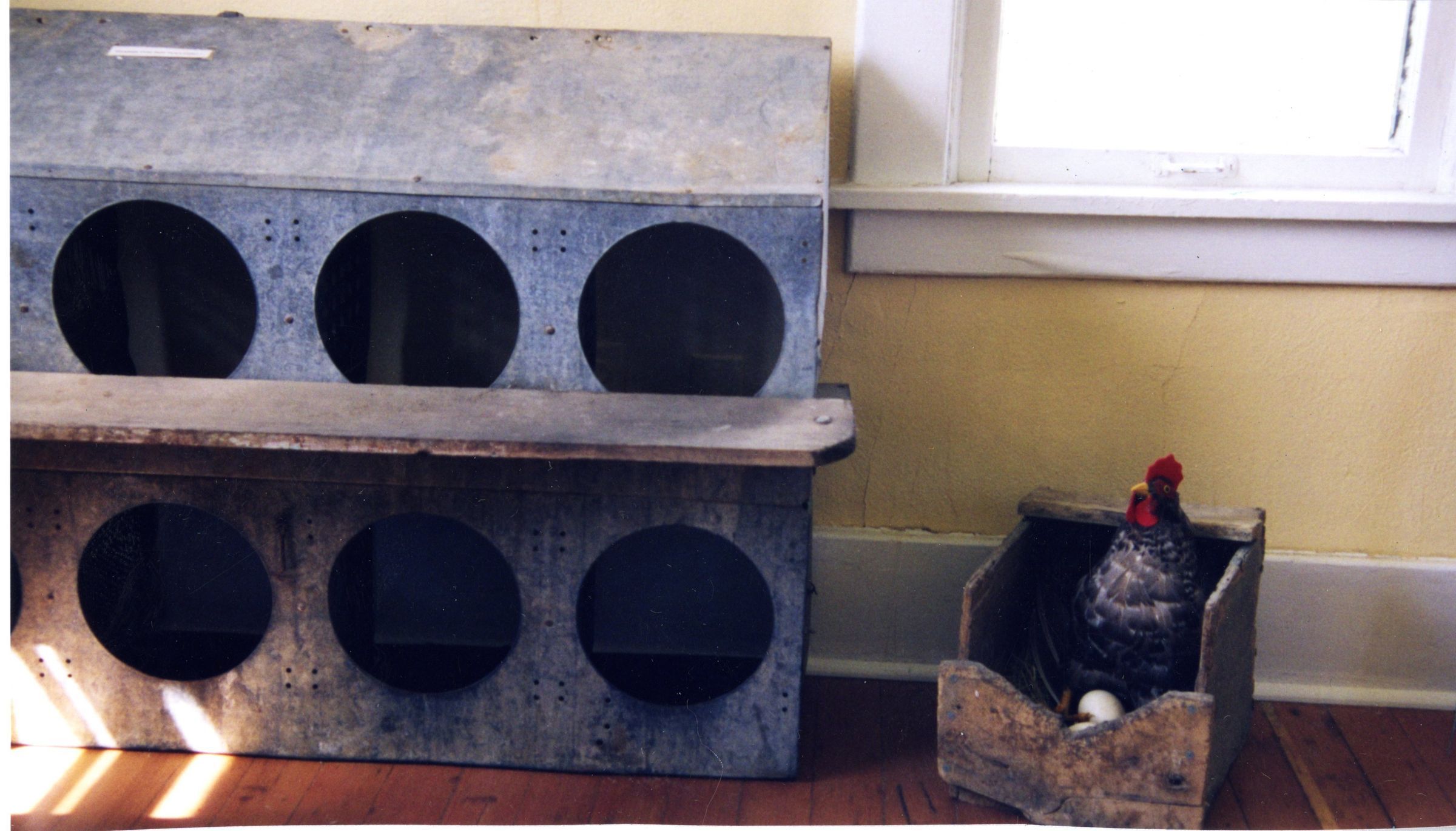 Nester's from Adobe House on 136th and Lowell. The chicken nester's house holds six nesters. Three nesting on top and three on the bottom. There is a chicken in a old box next to the nesting house with an egg in front of her. The nesting house is in a room in the house.