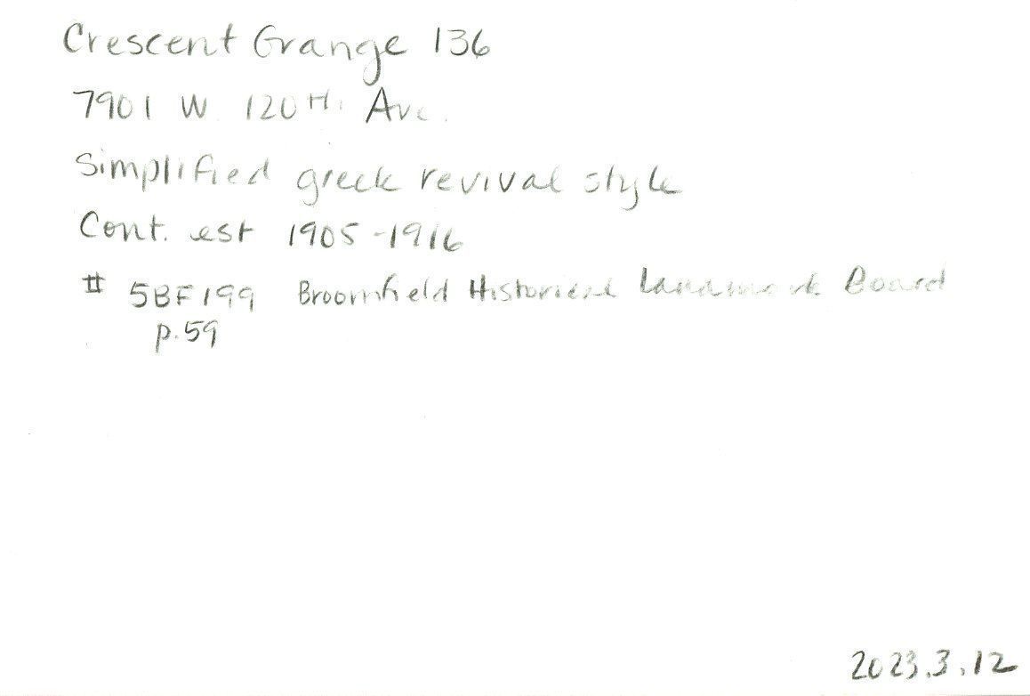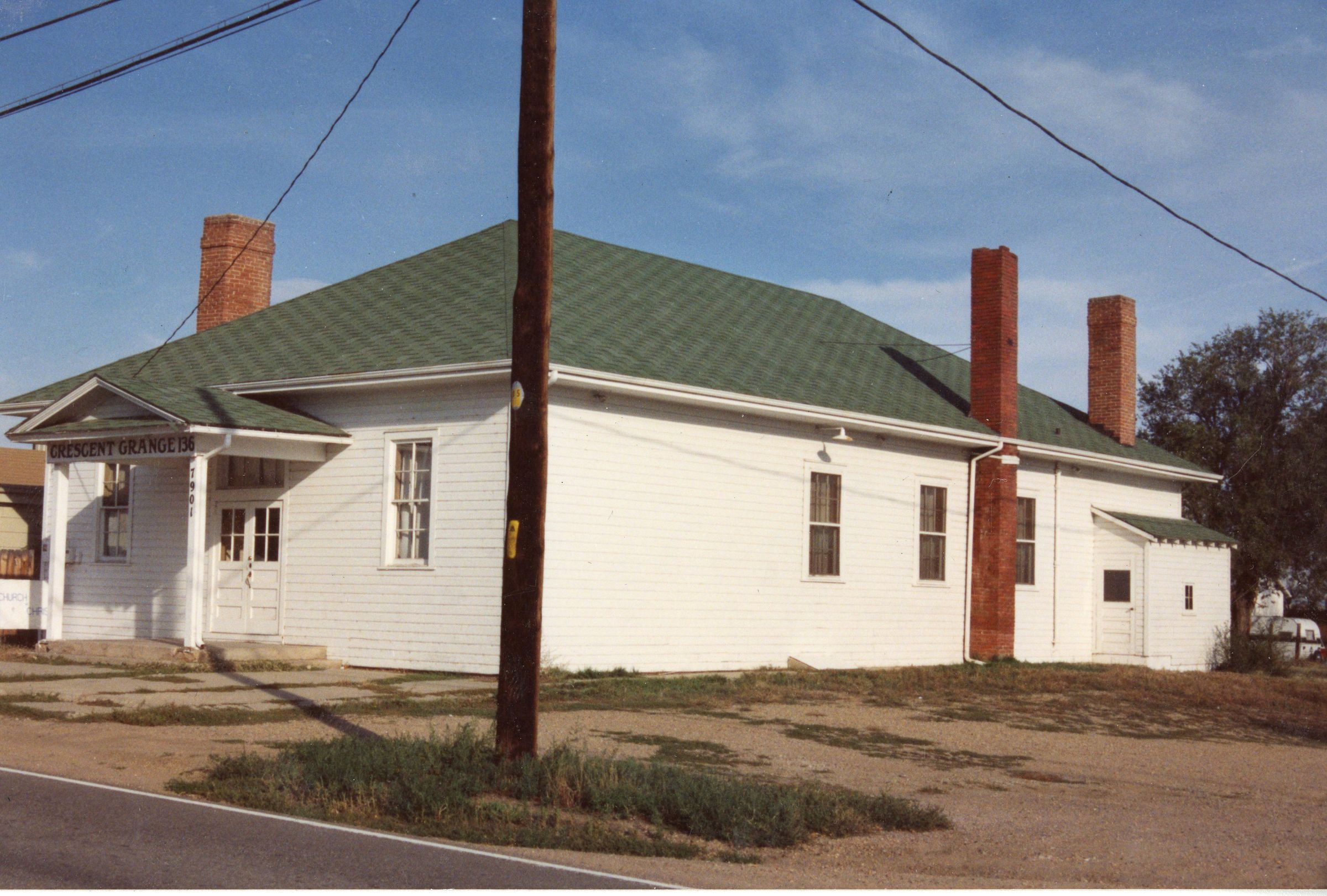 Color photo of the Crescent Grange circa 1993. Building has white siding, green shingled hip roof, and 3 red brick chimneys. Located at 7901 W. 120th Avenue. Constructed in 1905-1916 in the simplified Greek revival style. #5BF199 Broomfield Historical Landmark Board p. 59.