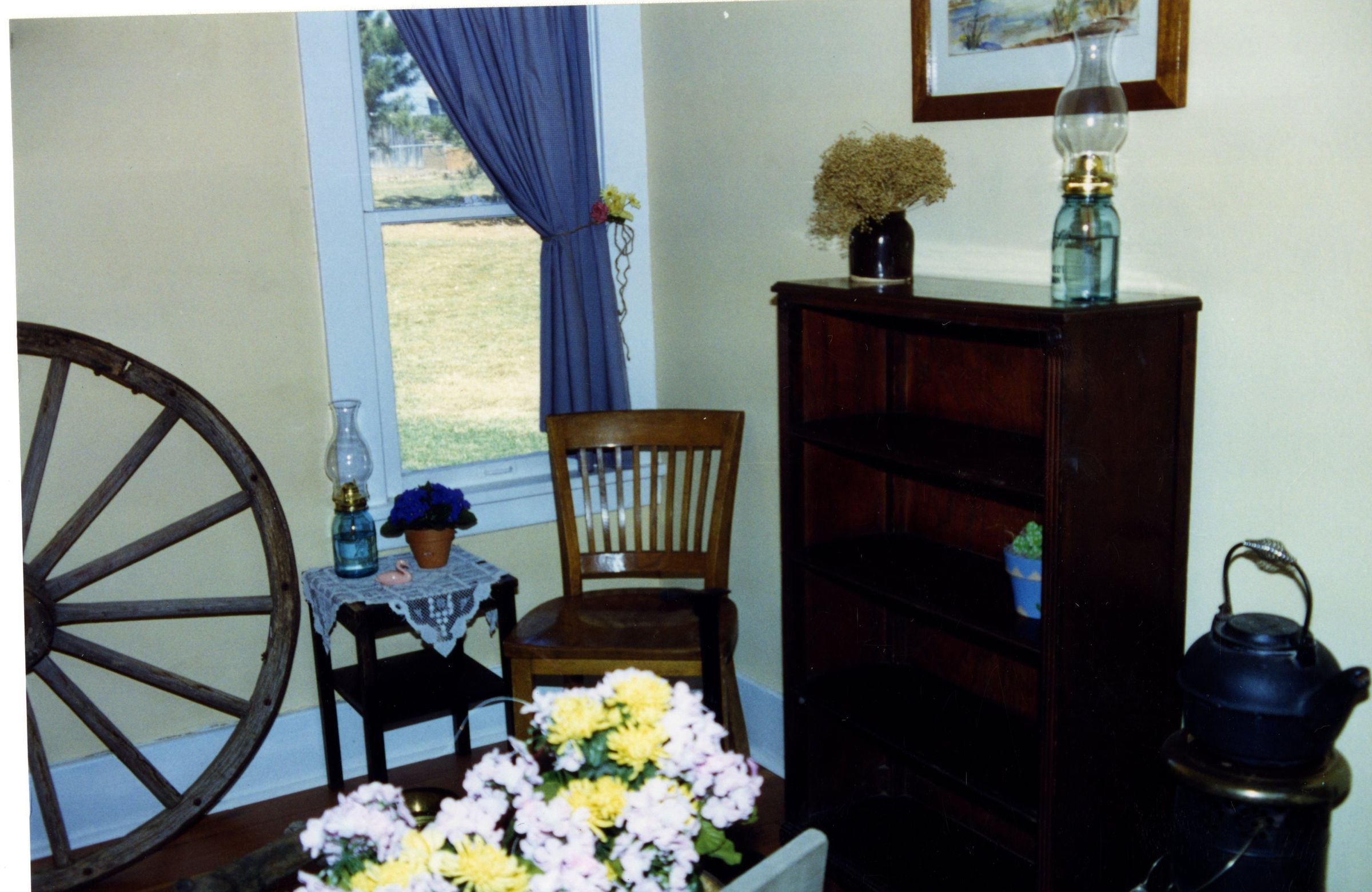Honey House. This is a room in the Honey House. The room hold a cabinet and wooden chair and a small table. There is a old wagon wheel leaning on the wall by a small window. There is also a large cast iron tea pot resting on a small table. There are displays of flowers and lanterns.