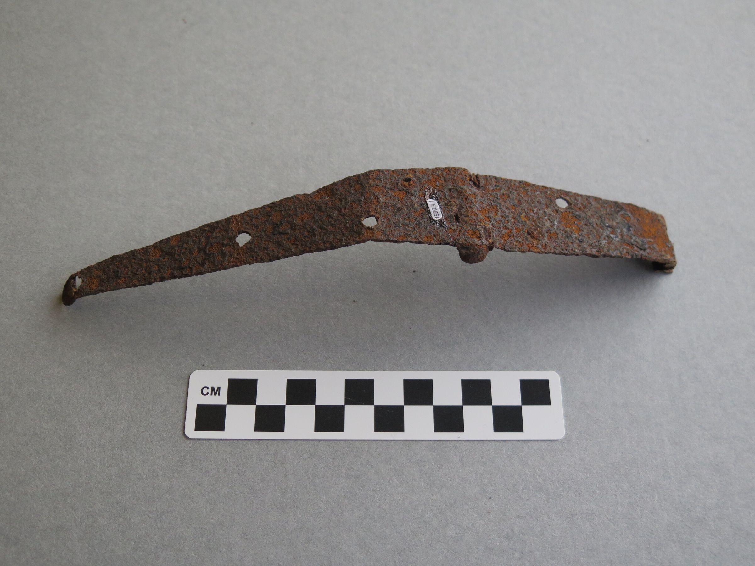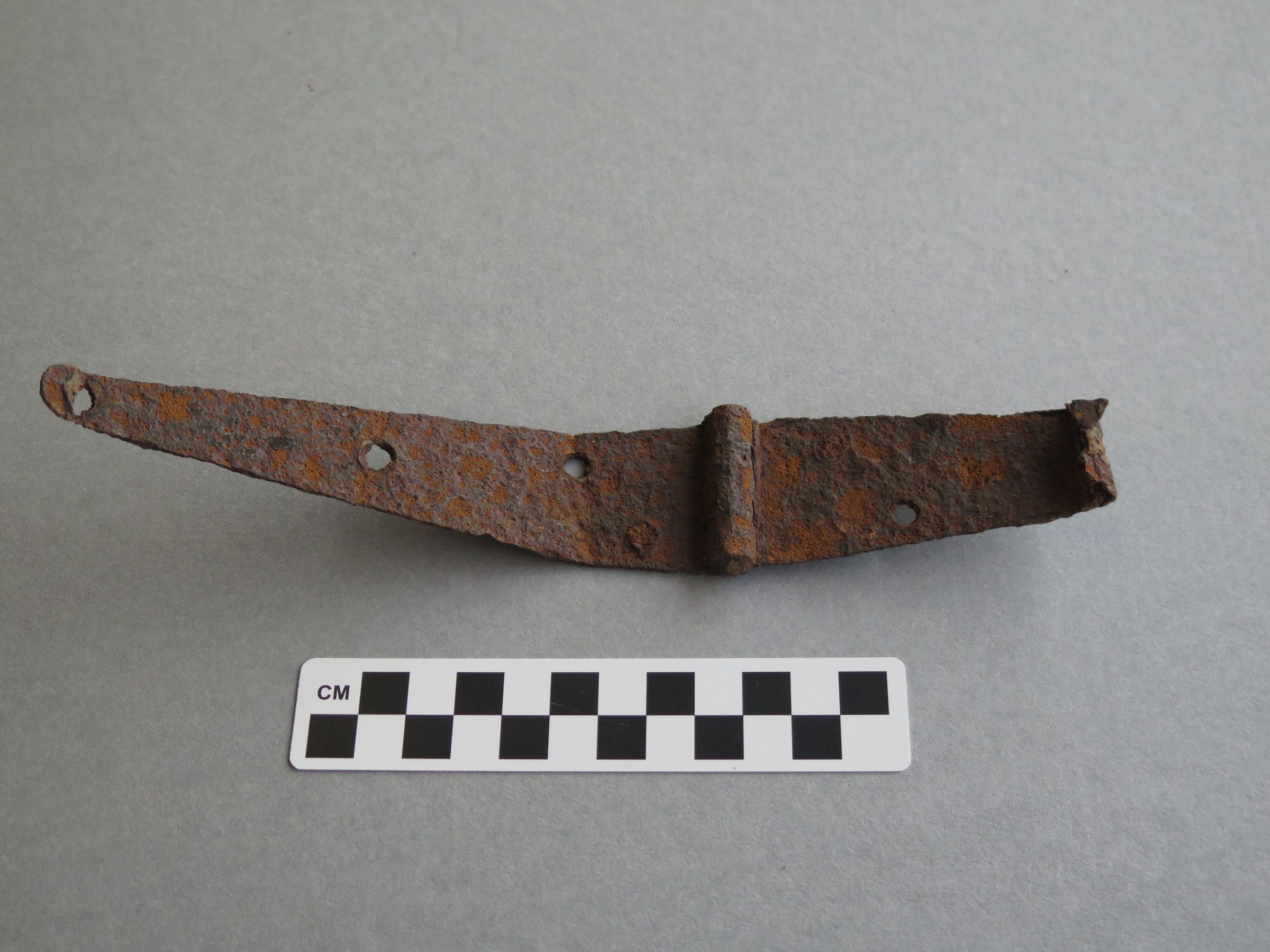 Iron metal hinge, two triangular straps on either side of the hinge. One has three attachment holes the other side is truncated with only one attachment hole. The hinge measures 5" (h) x 4" (w) x 23.5" (l).