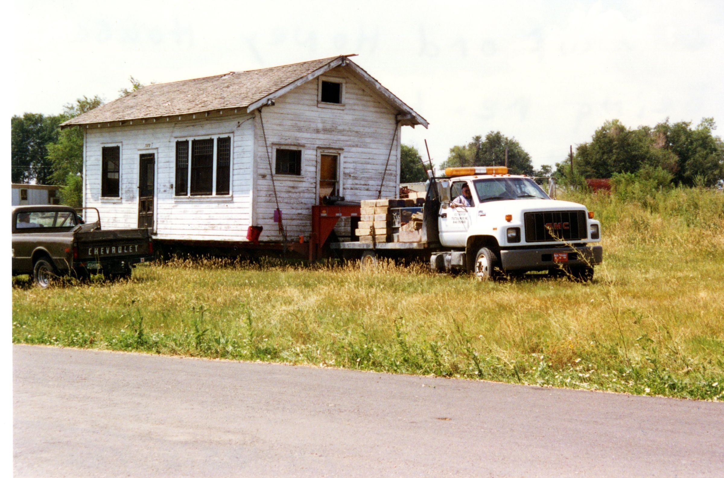 Honey House being moved to Depot Museum site. Truck pulling house toward street. part of chevy truck in view on left side of photo. Date; August 15, 1996.