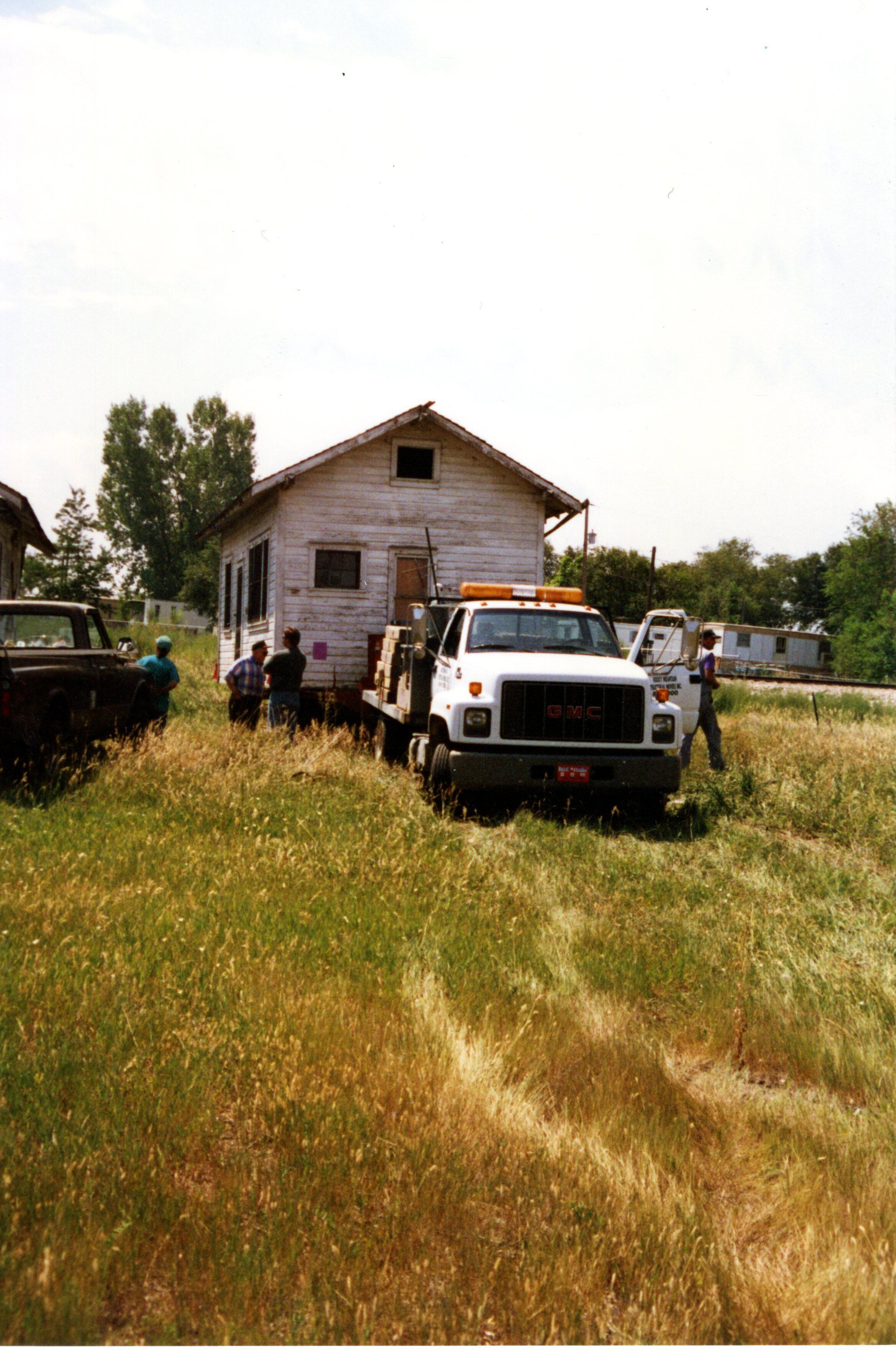 Honey House being moved to depot Museum site. Four men in front of house. House attached to white moving truck. Dark truck on front left side of house. Date: August 15, 1996.