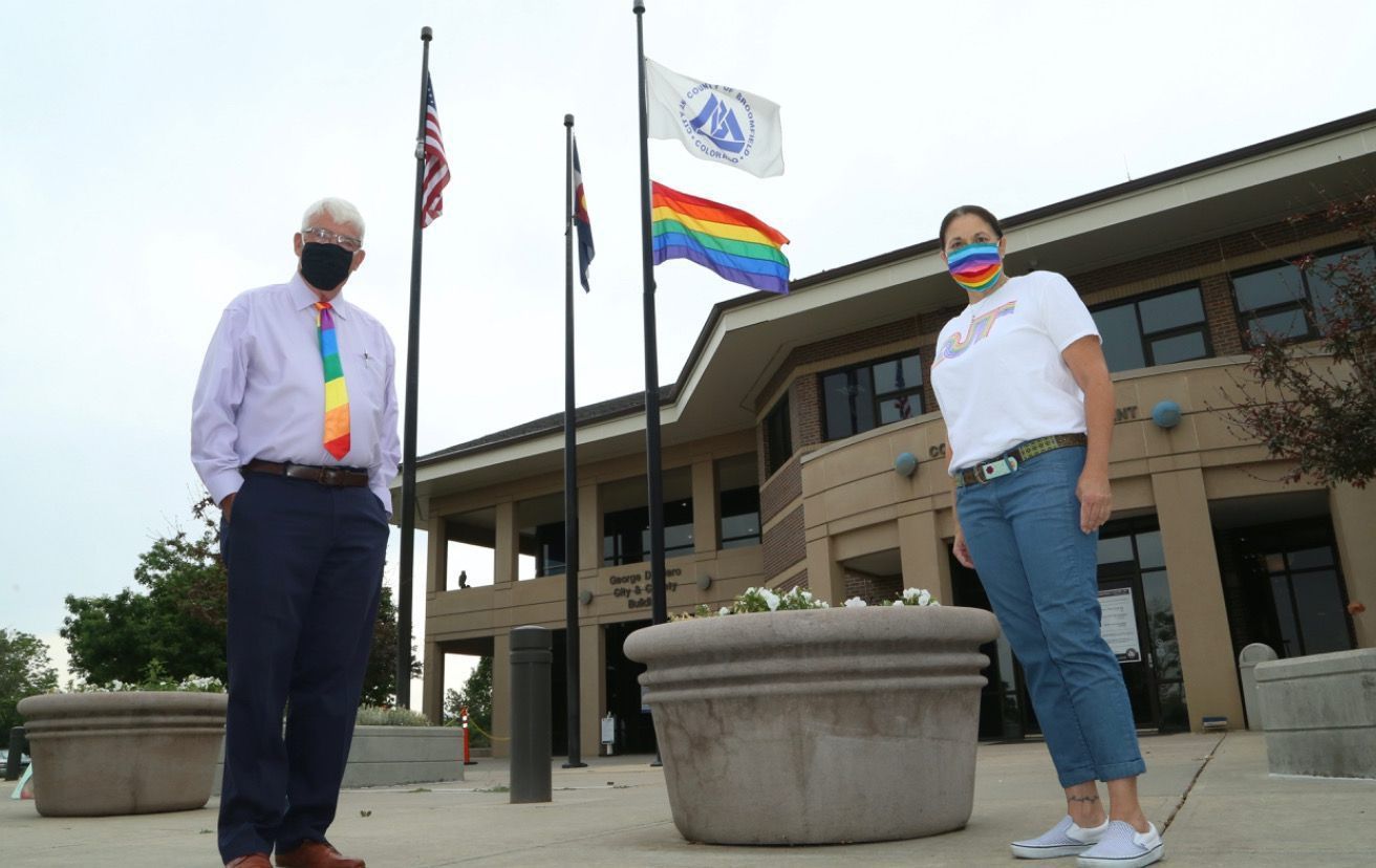 Photo of Mayor Guyleen Castriotta and Former Mayor Pat Quinn standing in front of the City and County Building at 1 Descombes Drive. Four flags fly between them: (R-L) The US Flag, the Colorado State Flag, the City and County of Broomfield Flag, and a Rainbow Flag.