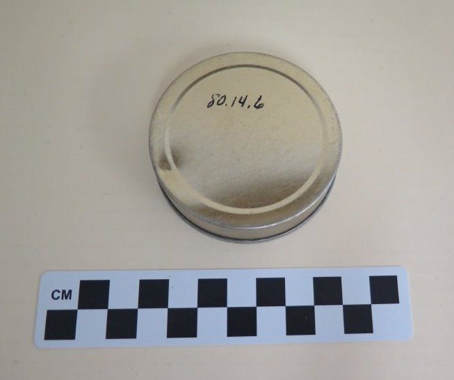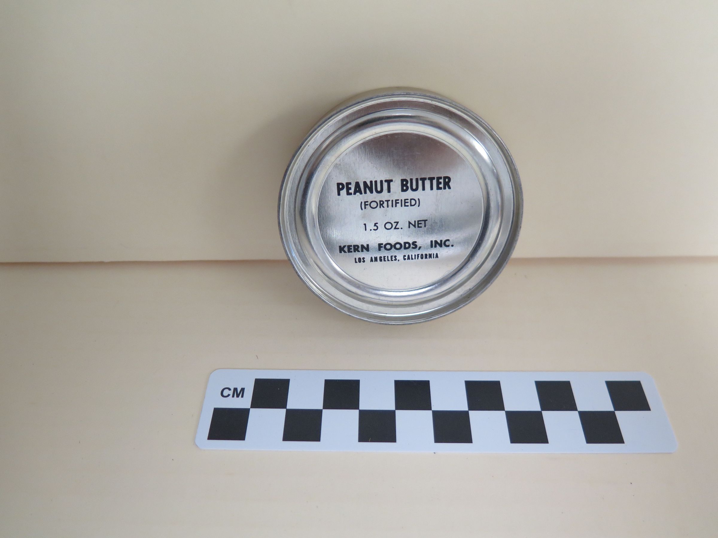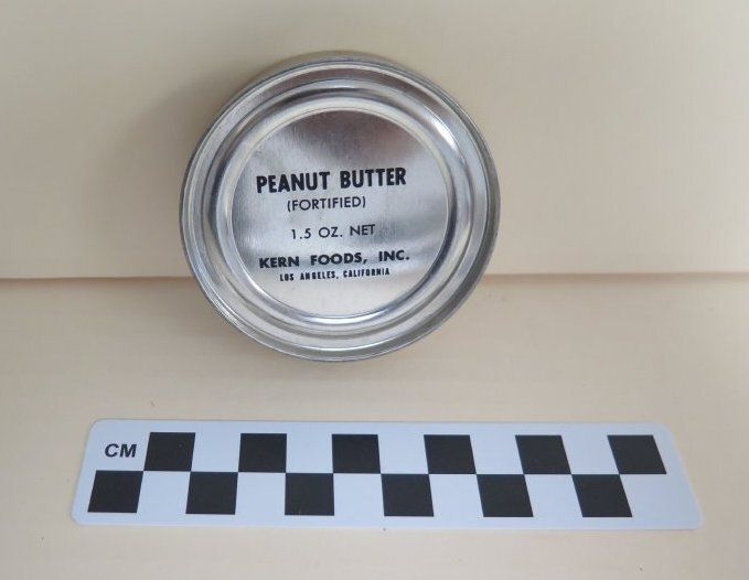 This is a can labeled as Peanut Butter. The can is shiny metal with black text on the top. The text on the top of the can reads, "Peanut Butter/ (Fortified)/ 1.5 Oz. Net/ Kern Foods, Inc./ Los Angeles, California". The can came from box 1980.14.3. The can measures 0.75" (h) x 2.75" (dia).Collection