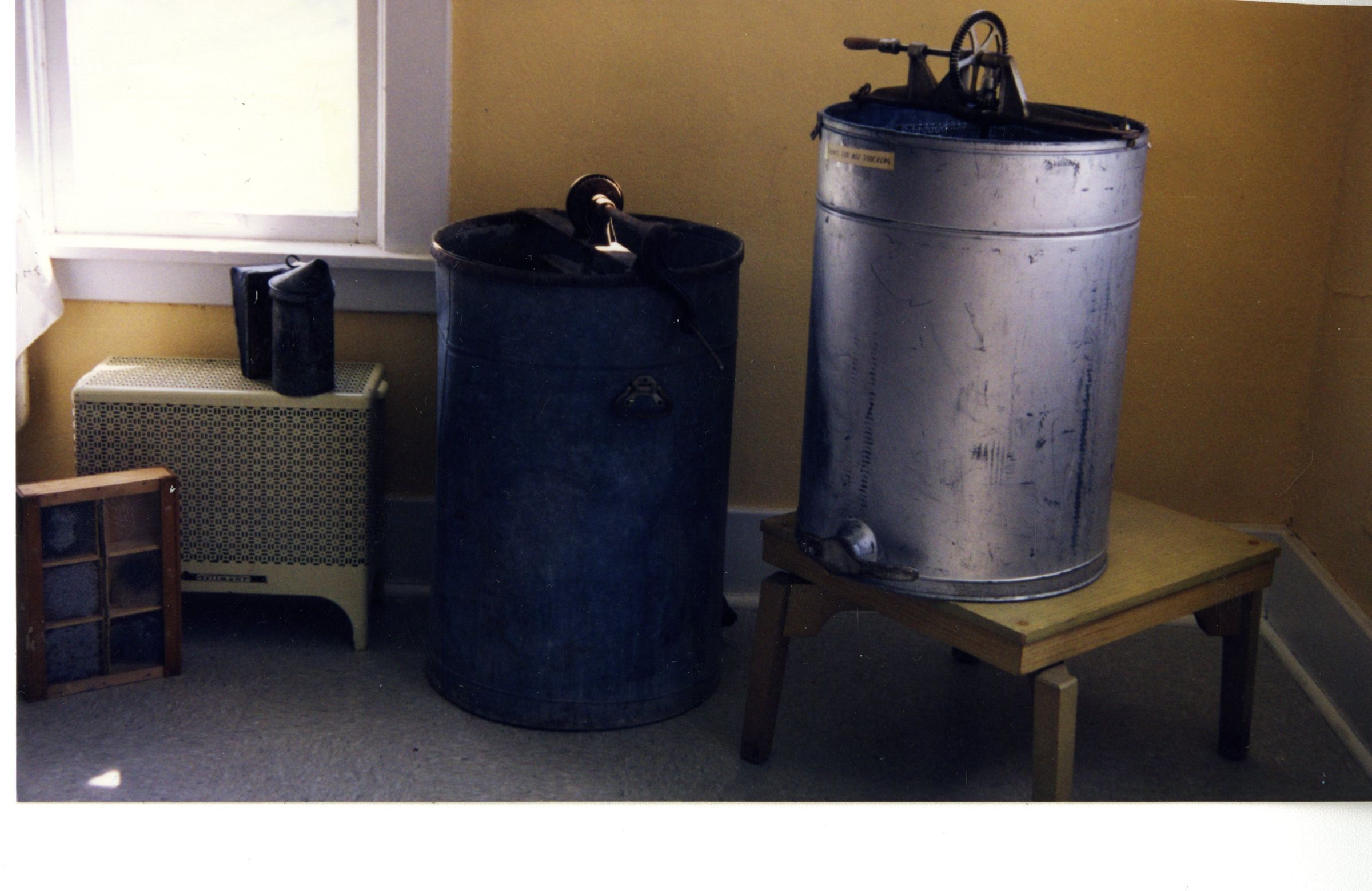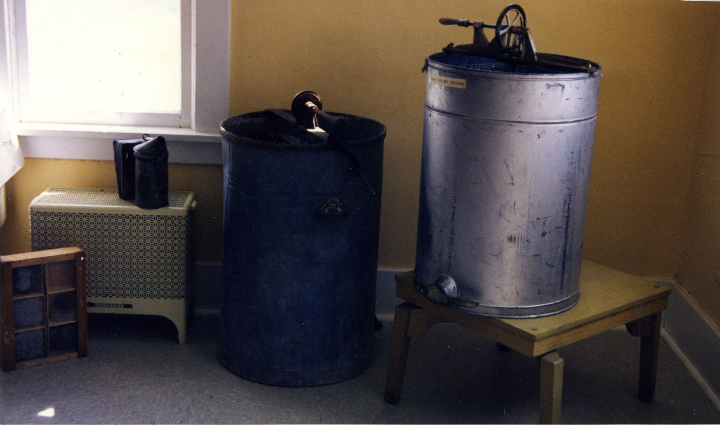 Honey Extractor in Honey House. Two metal containers sitting in a room in Honey House. One is on a table and the other in setting on the floor.