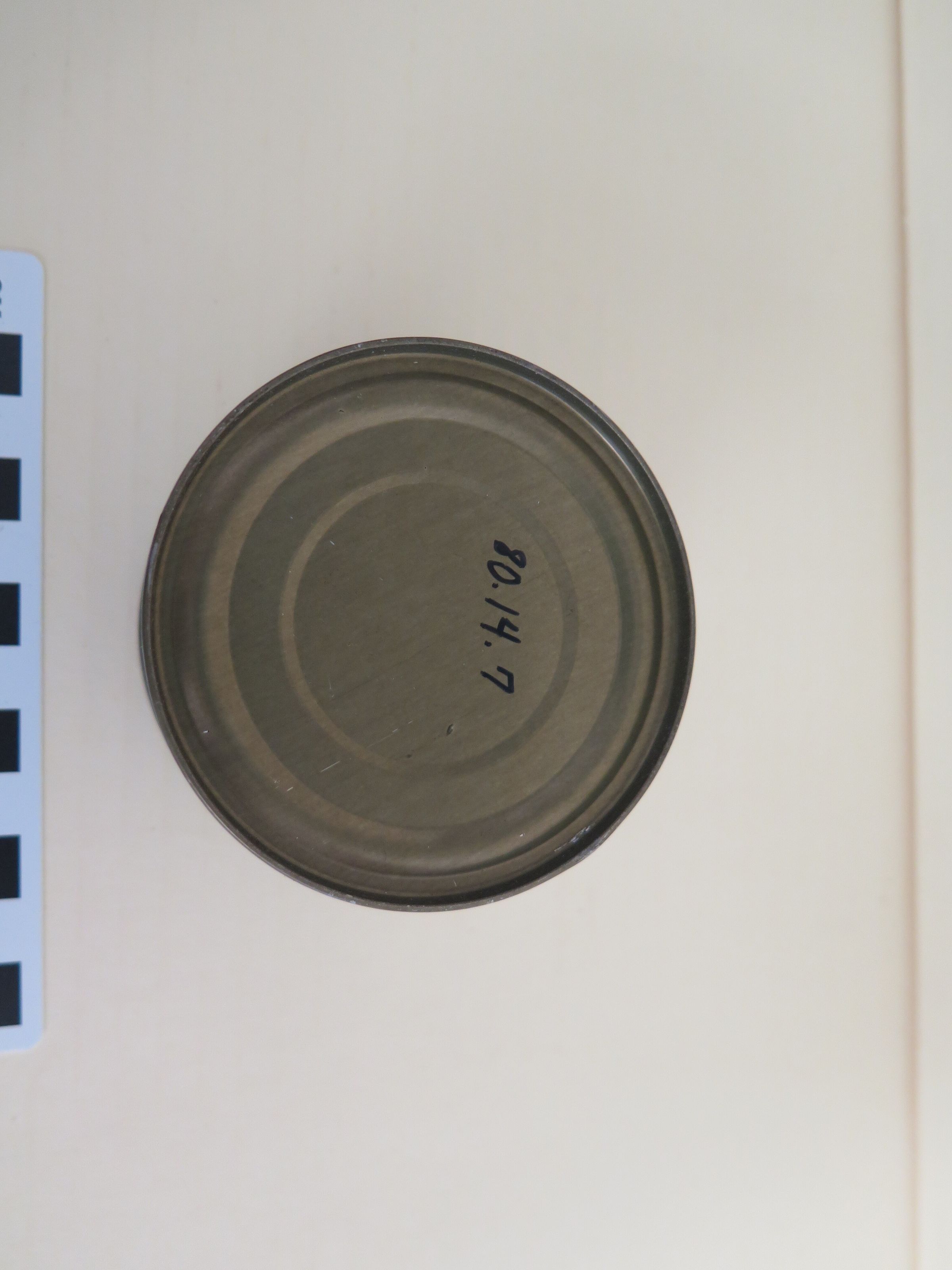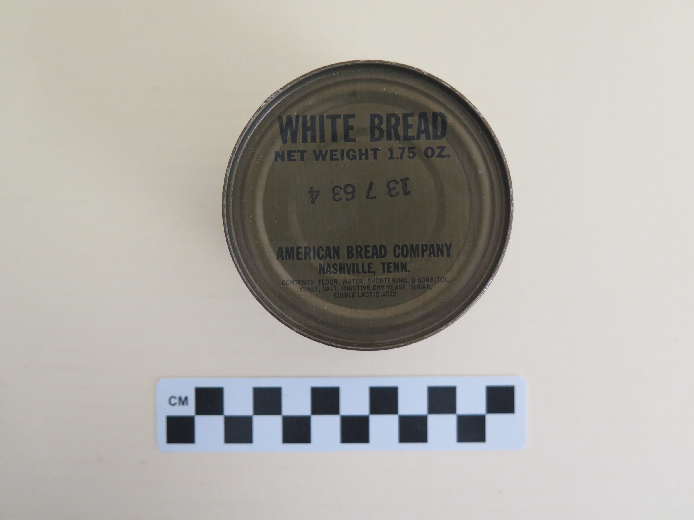 This is a can of White Bread from a Meal, Combat, Individual (MCI) ration. These rations were used between 1958 and 1980. The can is green with black text on the top. The text on the top of the can reads, "White Bread/ Net Weight 1.75 Oz./ American Bread Company/ Nashville, Tenn.". The ingredients are listed below this. The can came from box 1980.14.3. The can measures 2" (h) x 3" (dia).Collection