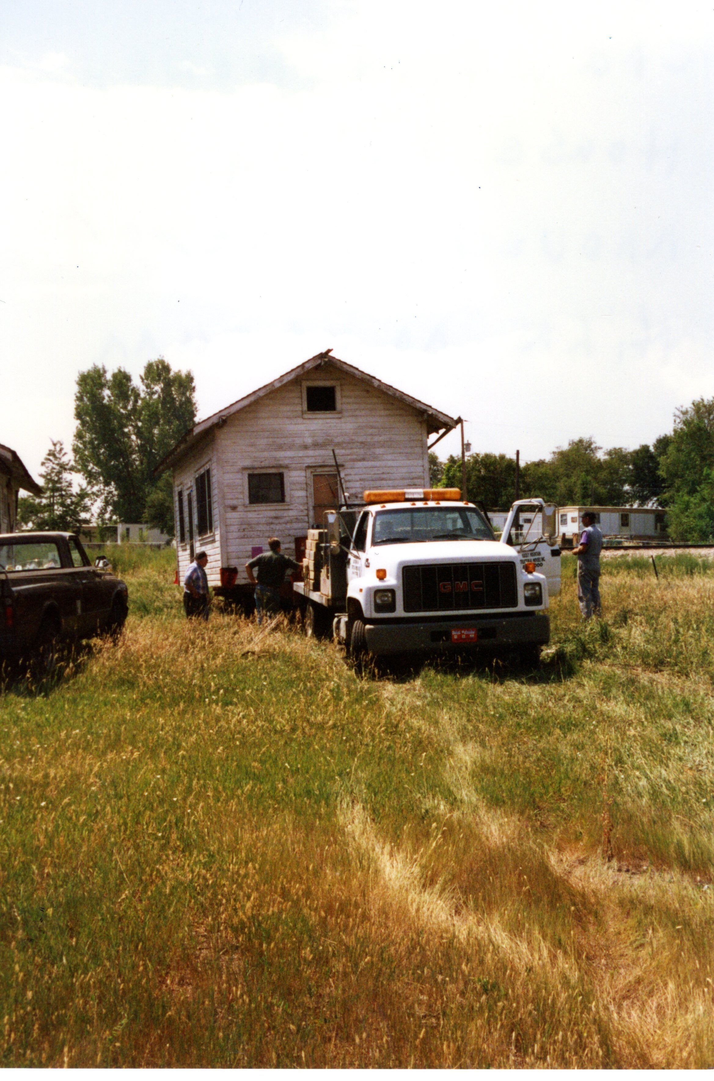Honey House being moved to Depot Museum site. Three men by white truck, one leaning on truck. Dark truck front left of house. Date:August 15, 1996.