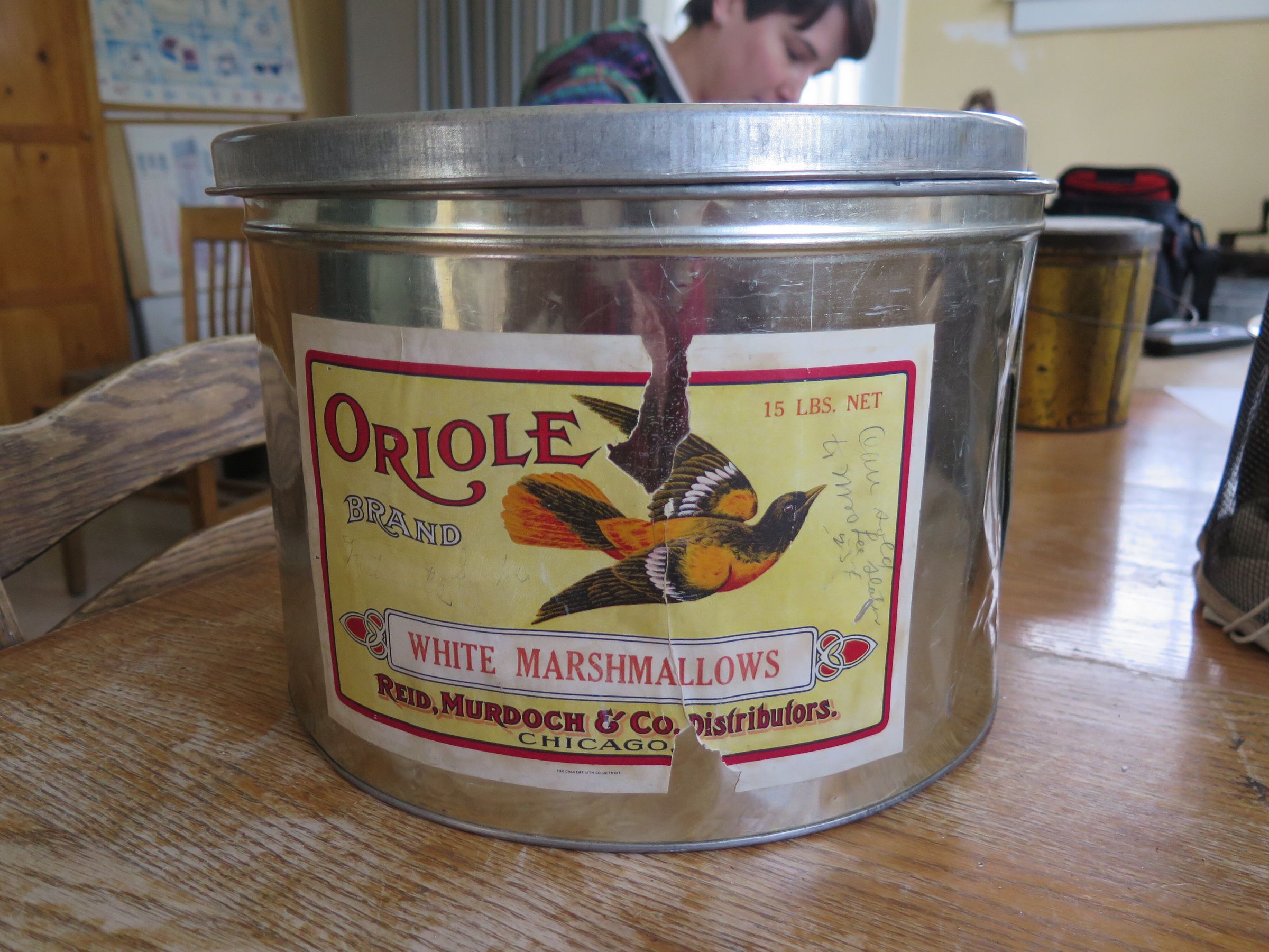This is a large food storage tin (a) and its lid (b) with a large label glues to the front. The label is for Oriole brand white marshmallows. There is a large bird pictured on the label Handwritten note reads "Can sold to Mrs. Lee Slater for $0.55." Other handwritten note reads "Materials Scraps." The brand of the tin is CANCO. The tin measures 8 1/4 (h) x 12 1/2 (diam) .