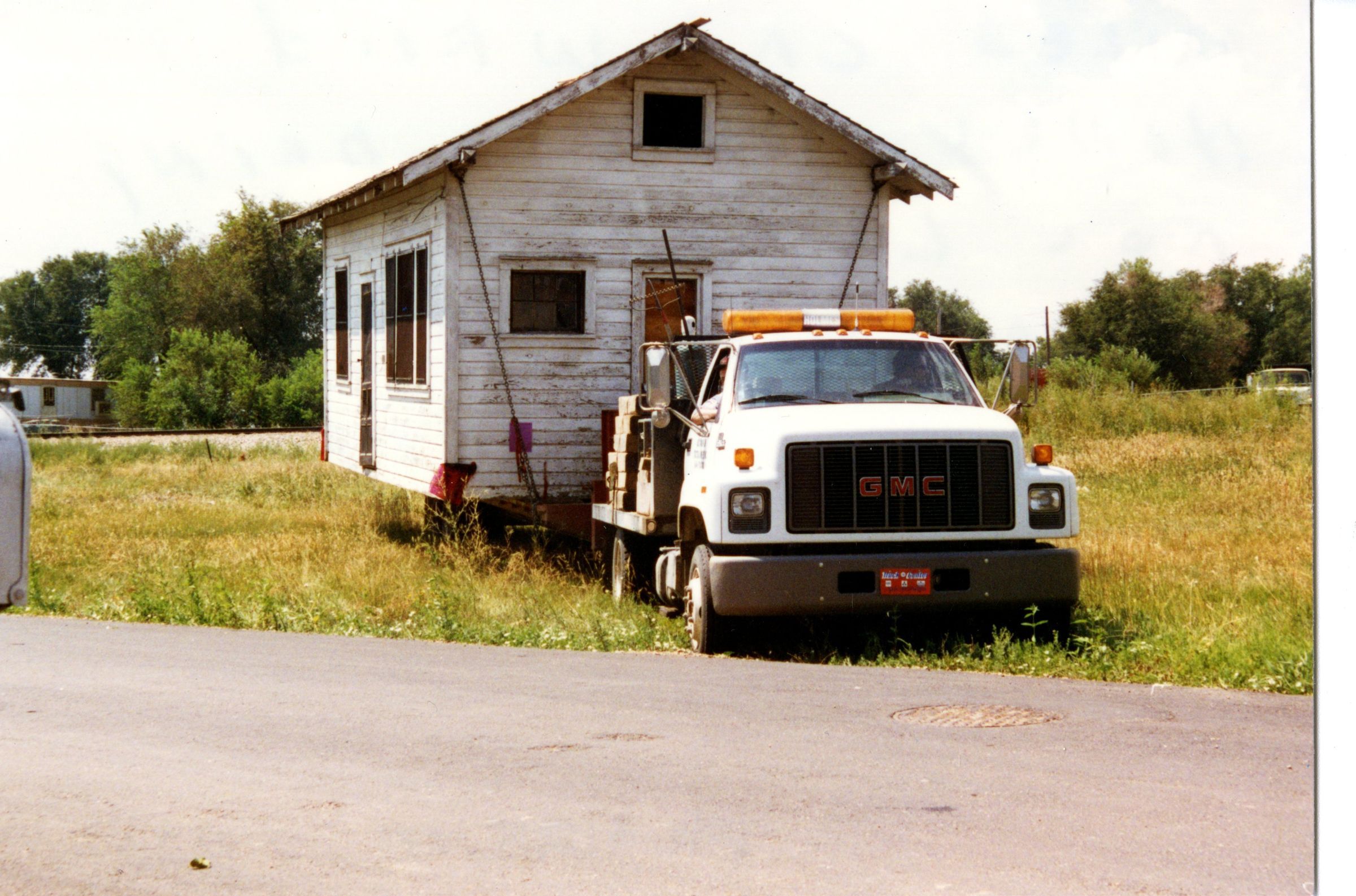 Honey House being moved to Depot Museum. Honey House bing pulled by white truck from field towards the road. Part of a mail box on left side. Date:August 15, 1996.
