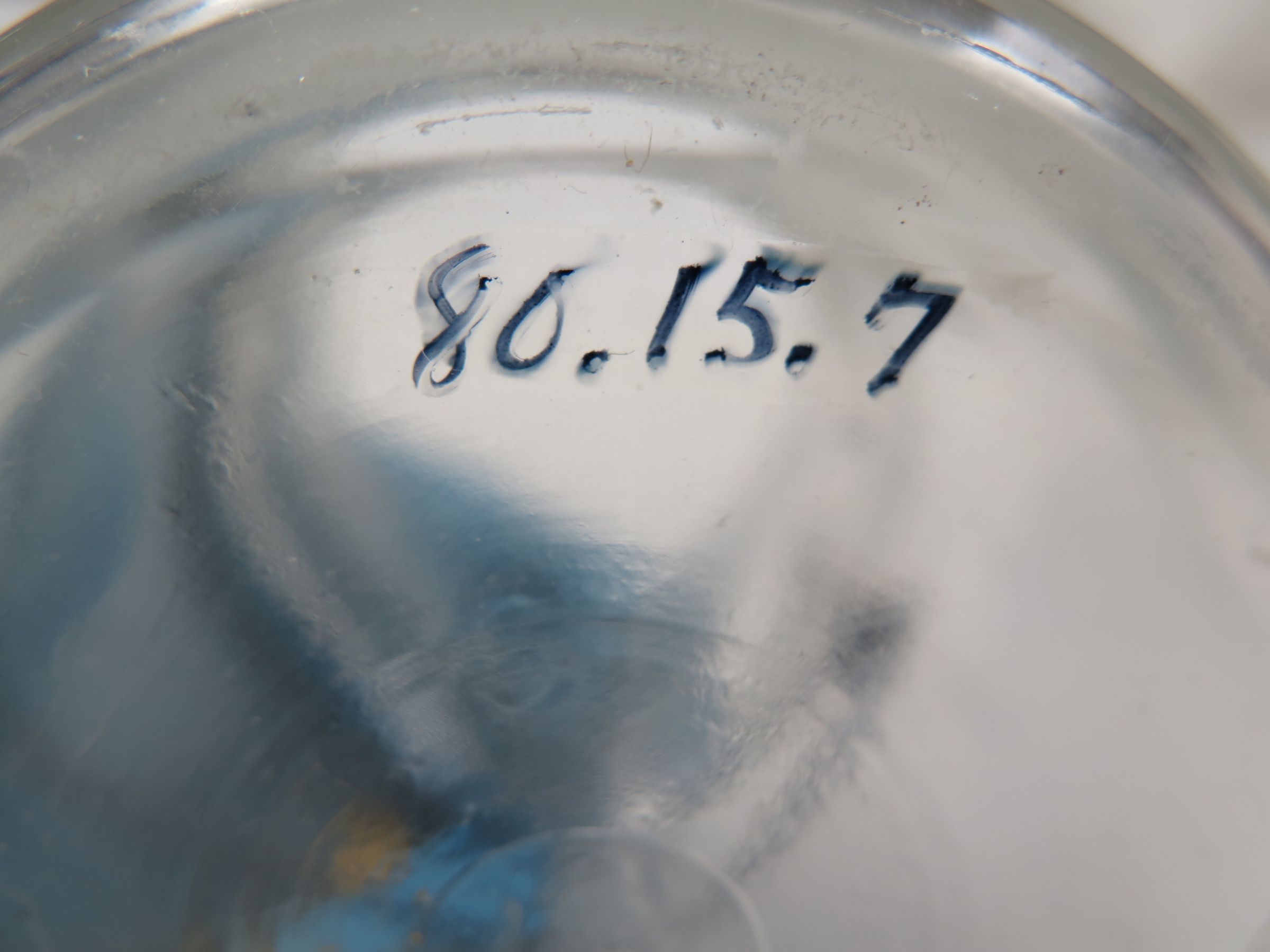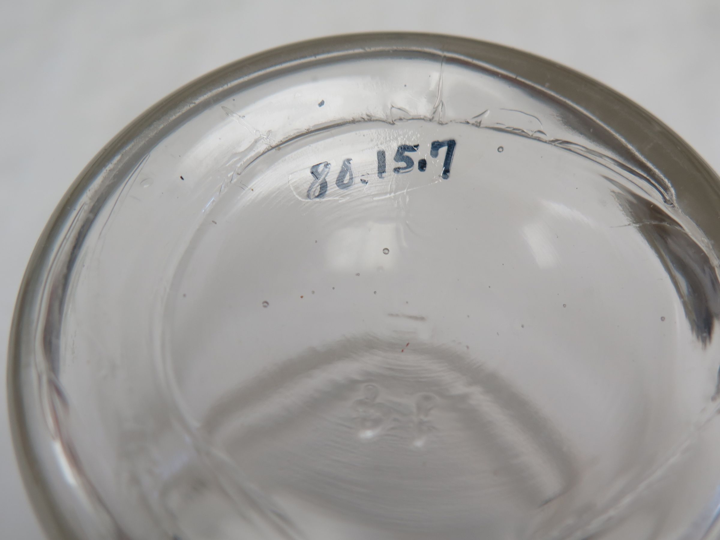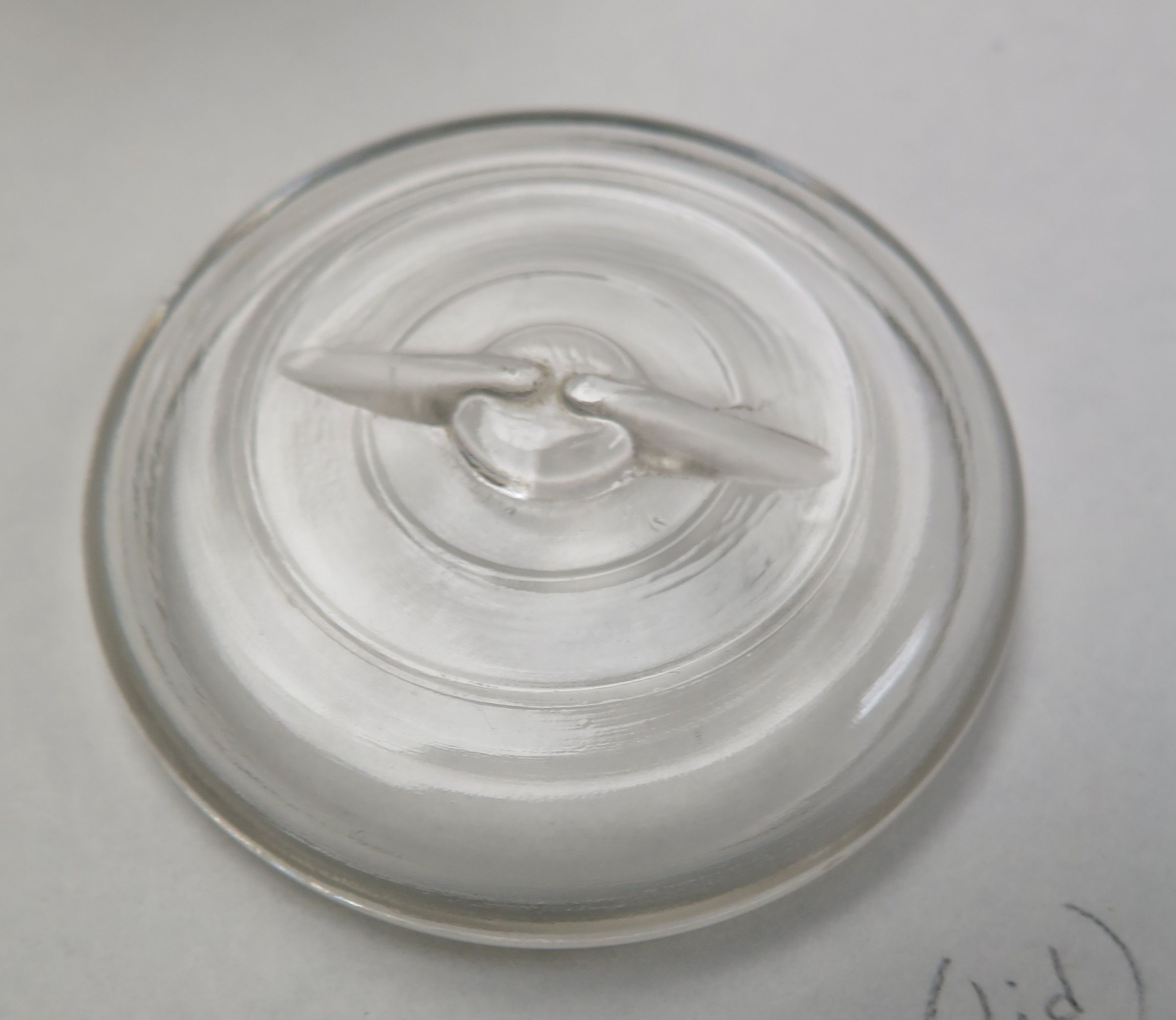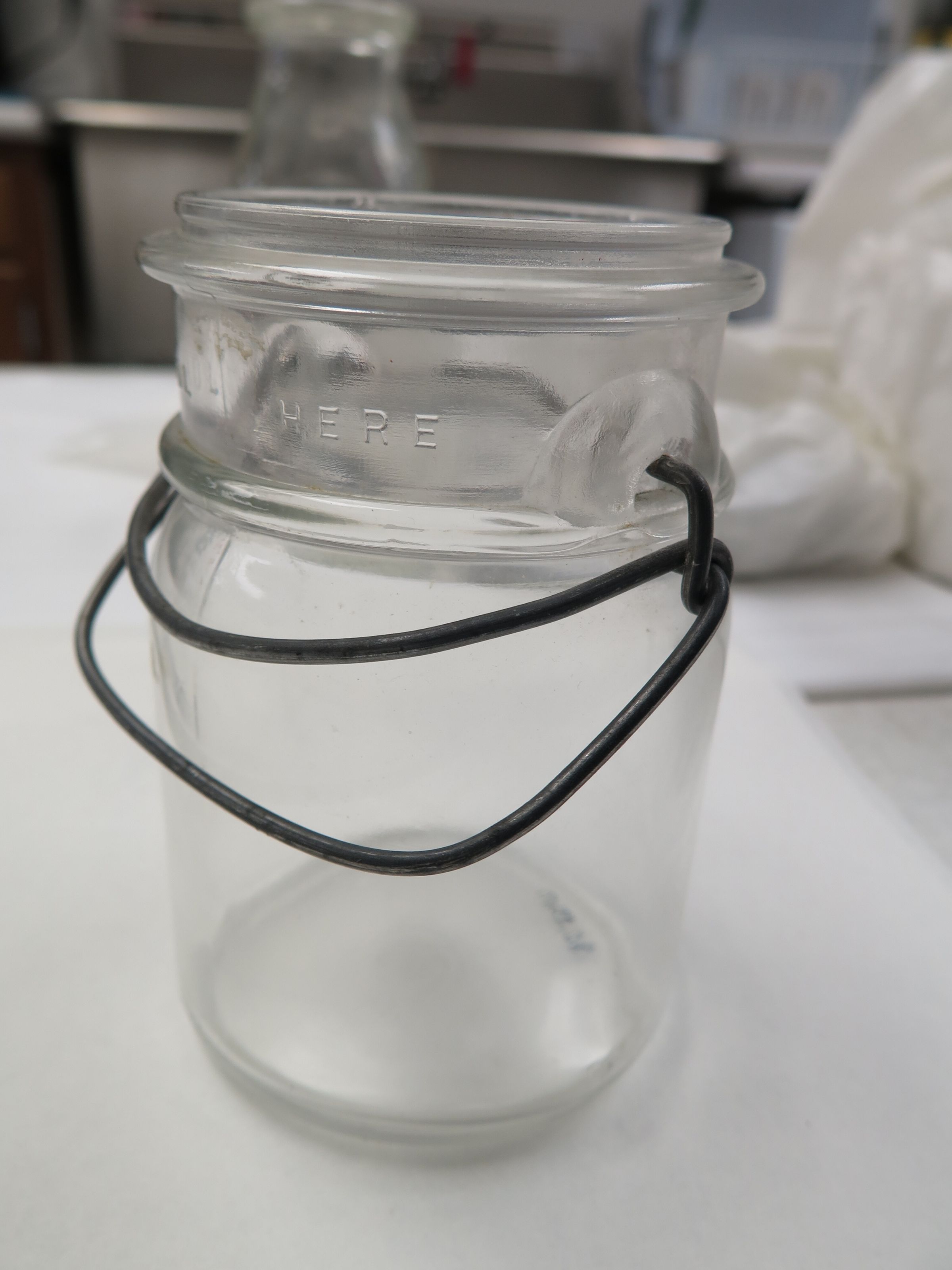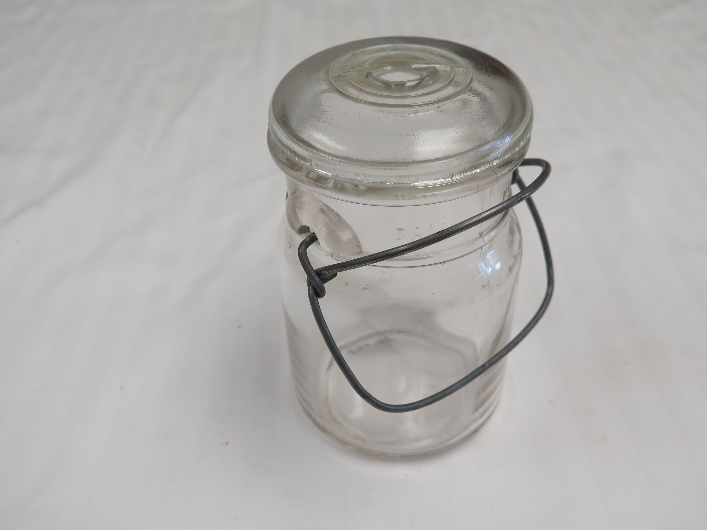This is a set of 2 clear glass 1-pint canning jars with glass lids and wire bails. The lids are clear glass. The jars each measure 5" (h) x 3" (dia).Collection