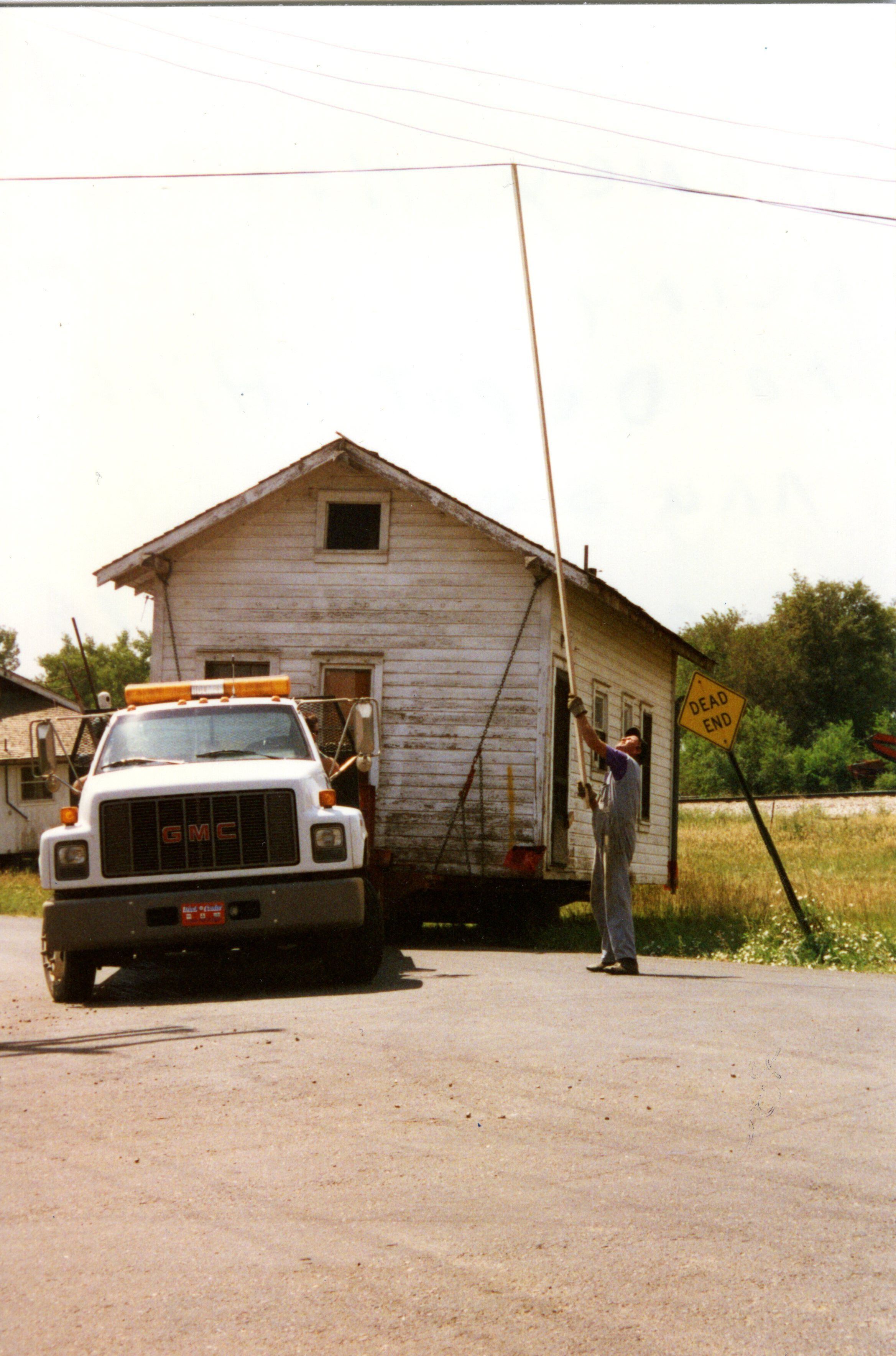 Honey House being moved to Depot Hill Museum. Hose is being pulled onto the street. Man lifting wire with stick. "Dead End" street sign on side of house. Date: August 15, 1996.