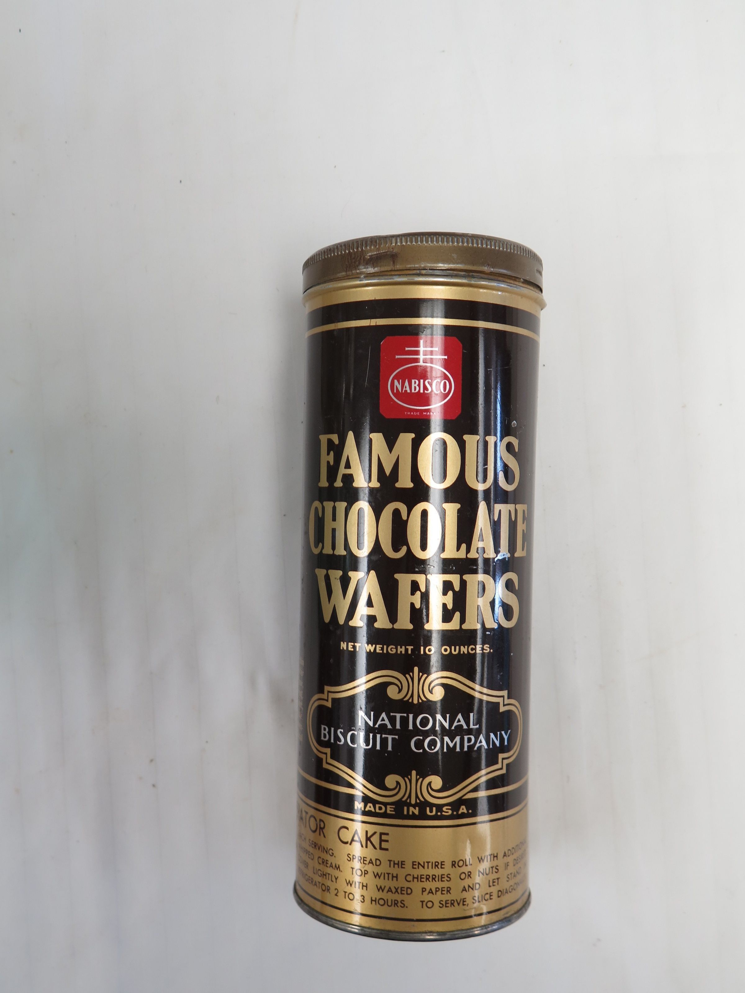 This is a metal tin of Nabisco brand Famous Chocolate Waffers. The tin label is brown and gold with a brass colored lid. The tin measures 8.25" (h) x 3 (dia).