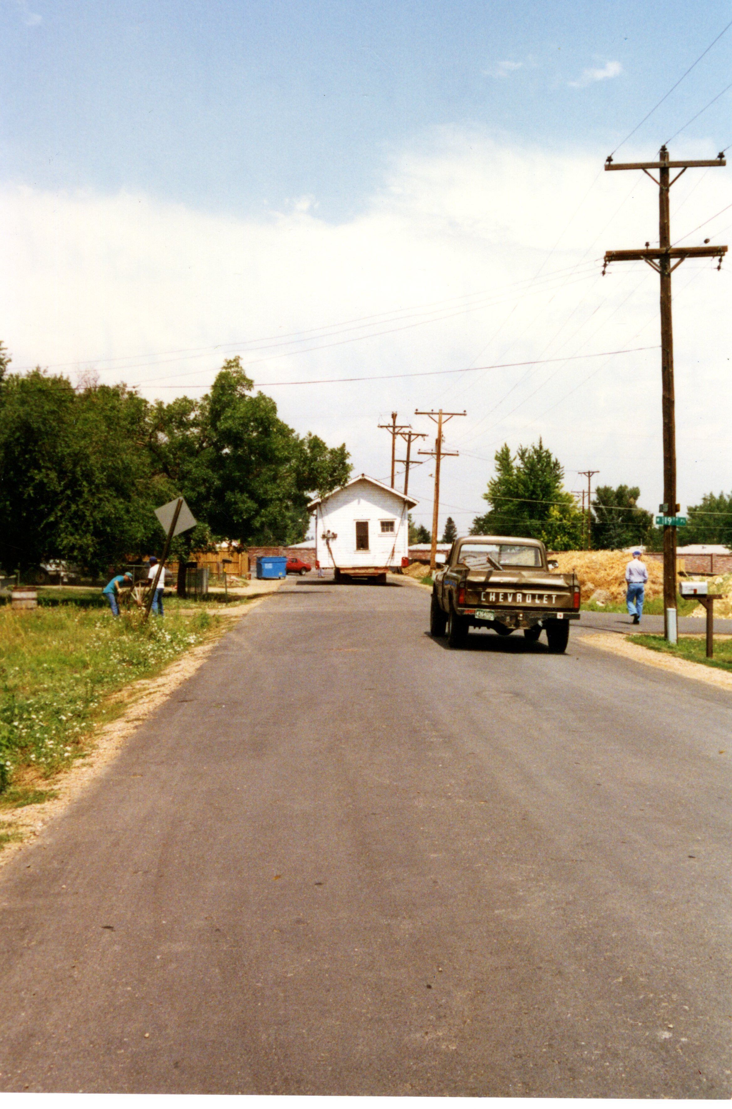 Honey House being moved to Depot Hill Museum. Honey House being pulled up the street. Chevy truck following behind the house. Man crossing 19th street. Two men on the other side of the street. Date:August 15,1996.