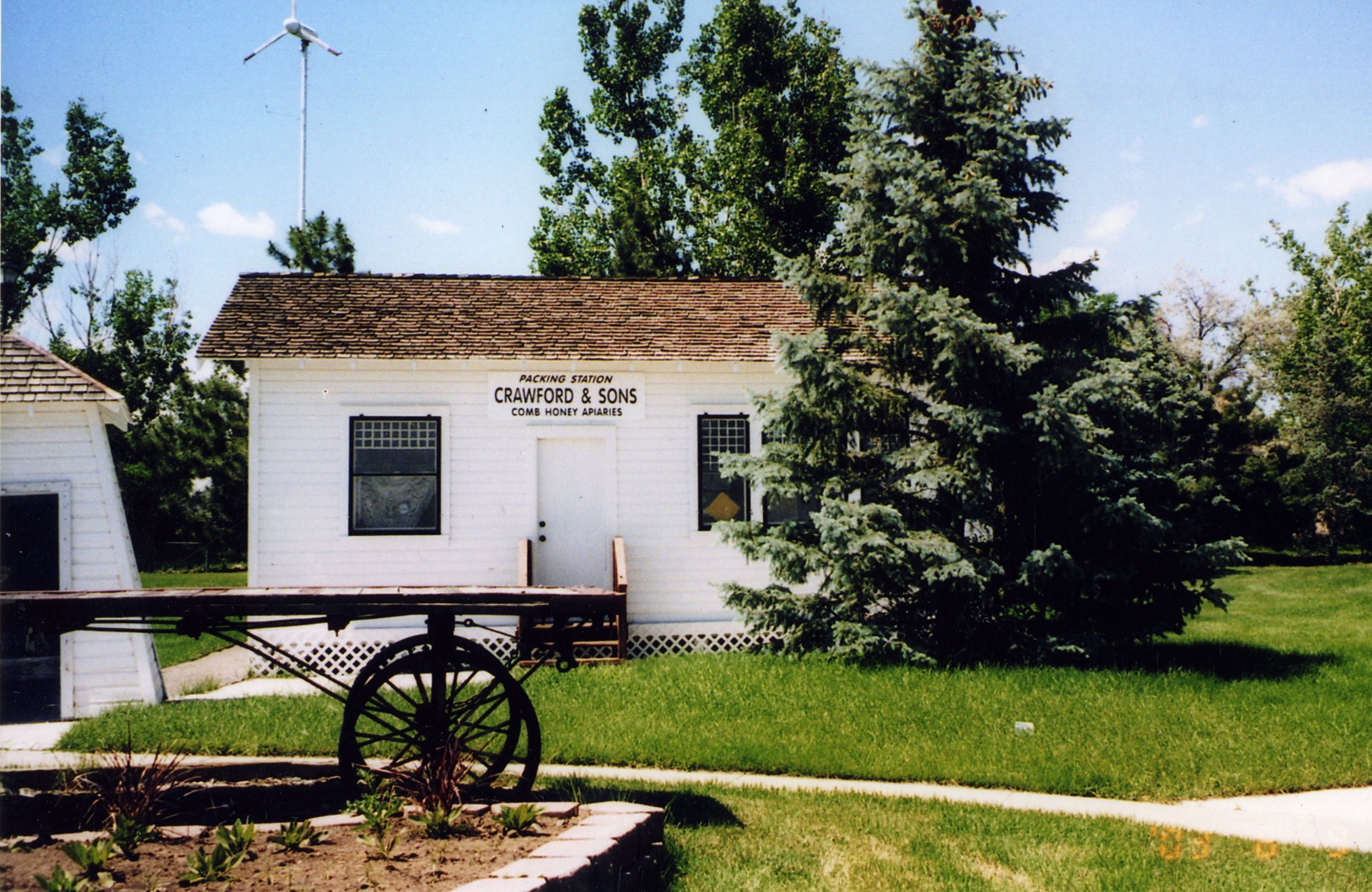 Honey House in Zang Spur Park. Exterior shot of white building with railroad luggage cart in front. Sign on building says"Packing Station, Crawford & Sons, comb honey apiaries". Pump house to left.