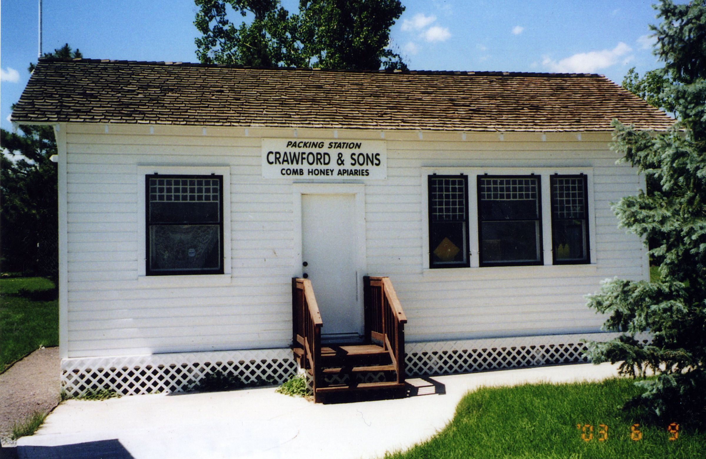 Exterior photo of Honey House in Zang Spur Park. Sign on front "Packing Station, Crawford & Sons, comb honey apiaries".