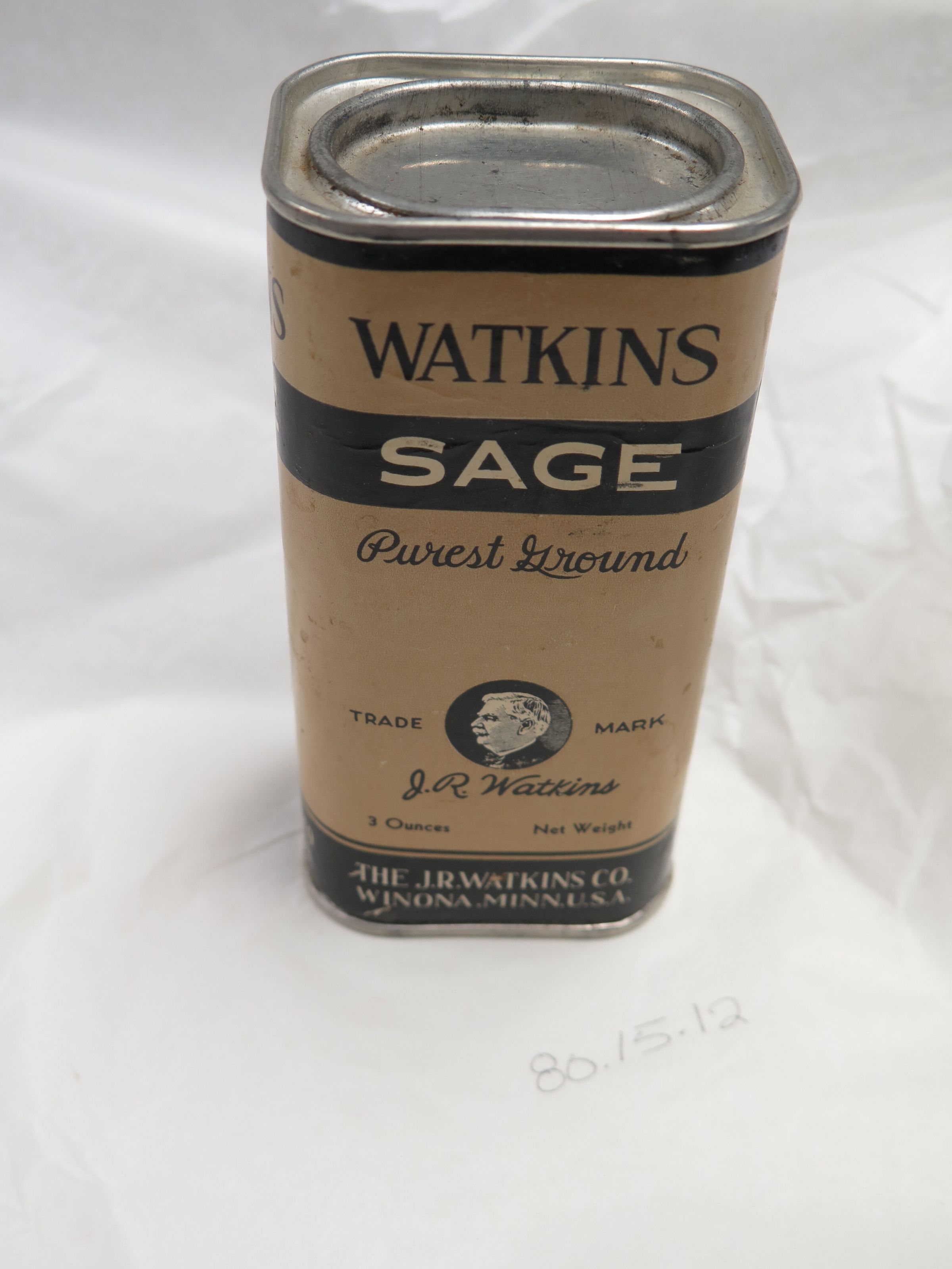 This is a metal tin of Watkins brand Sage. The tin has a yellow and brown label around it. The tin measures 5" (h) x 2" (w) x 2.5" (d).