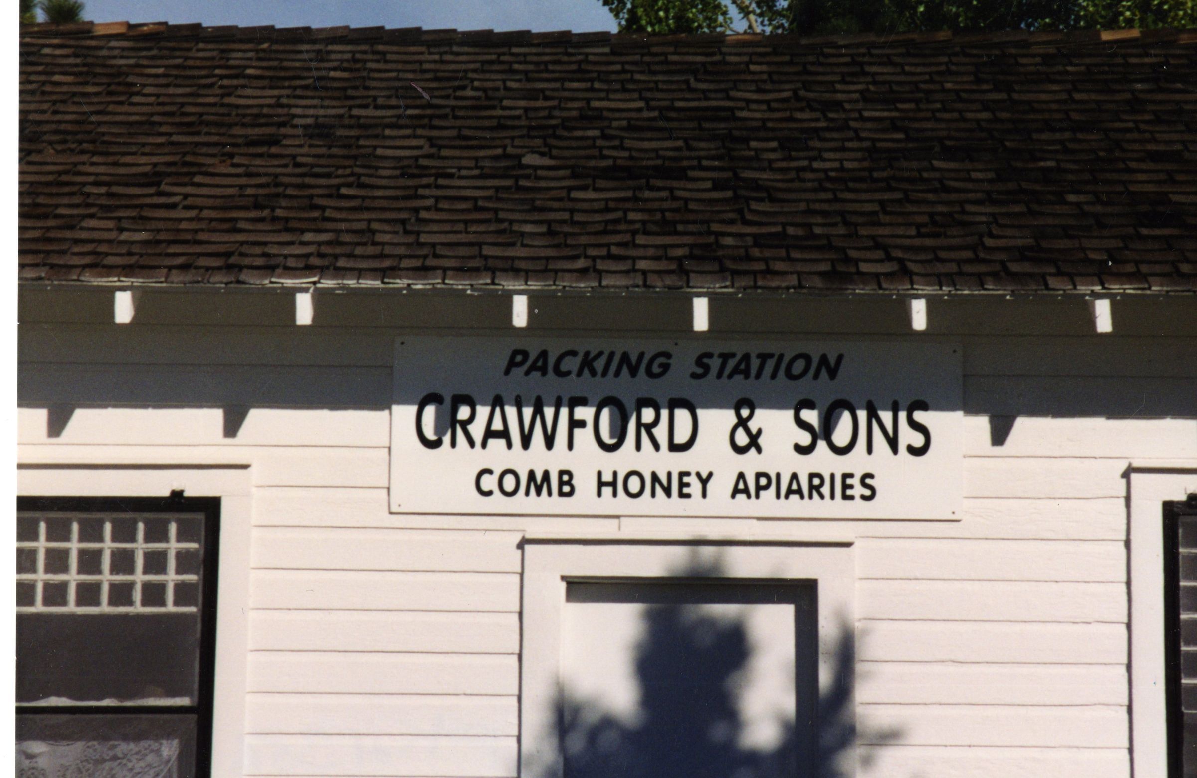 Close up of exterior of Honey House in Zang Spur Park. Sign on front of building "Packing Station, Crawford & Sons, comb honey apiaries".