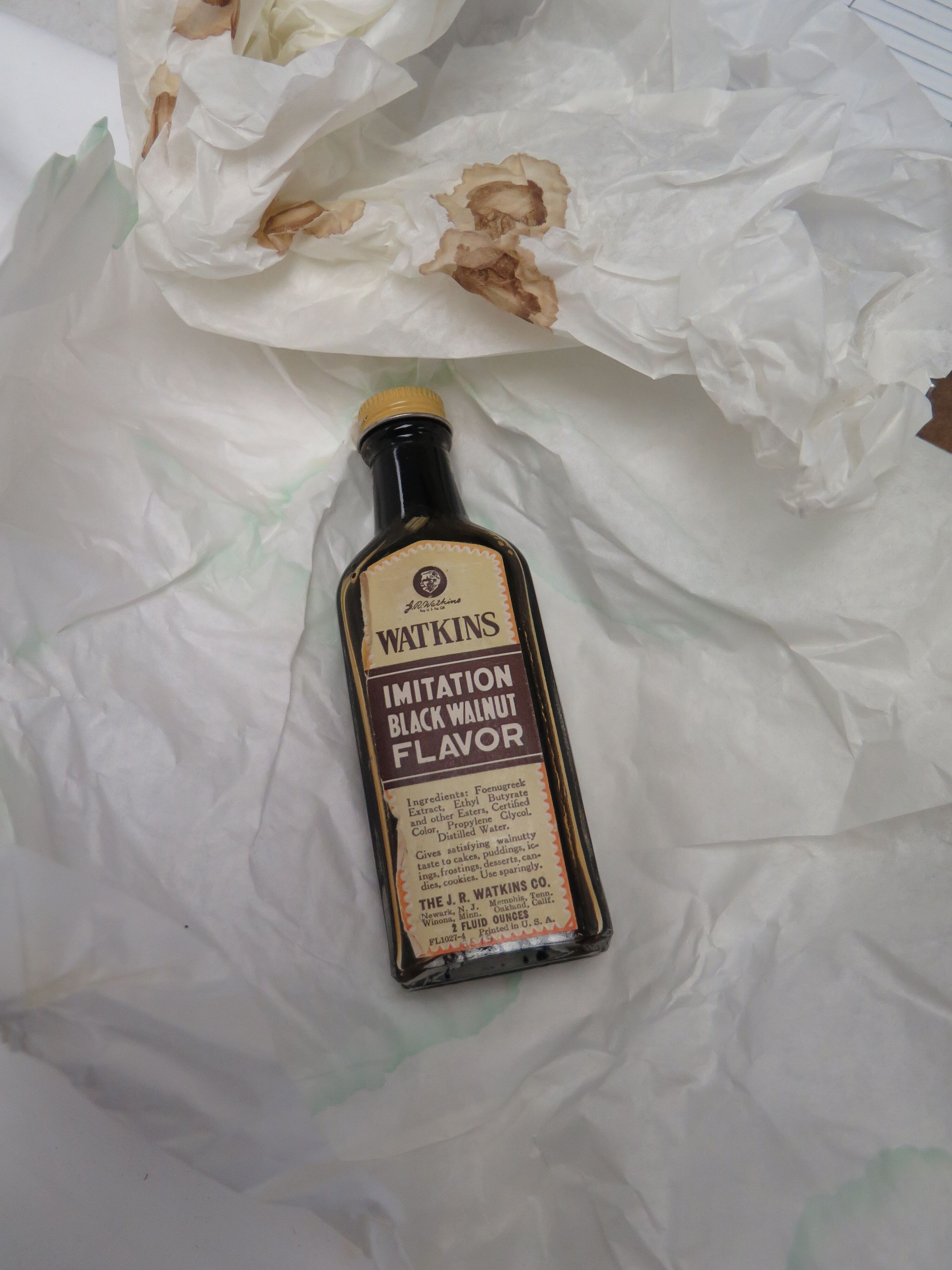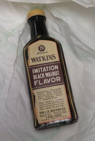 This is a glass bottle of Watkins Imitation Black Walnut Flavor with a metal lid. The white sticker on the front of the bottle has purple text that reads, "J.R. Watkins/ Reg. U.S. ?? Oil/ Watkins/ Imitation/ Black Walnut/ Flavor/ Ingredients: Foenugreek Extract, Ethyl Butyrate/ and Other Esters, Certified/ Color, Propylene Glycol,/ Distilled Water/ Gives satisfying walnutty/ taste to cakes, puddings, ic-/ ings, frostings, desserts, can-/ dies, cookies. Use sparingly./ The J.R. Watkins Co./ Newark, N.J. Memphis, Tenn./ Winona, Minn. Oakland, Calif./ 2 Fluid Ounces/ FL1027-4 Printed in USA". The bottle measures 5.5" (h) x 1.75" (w) x 0.75" (d).Collection