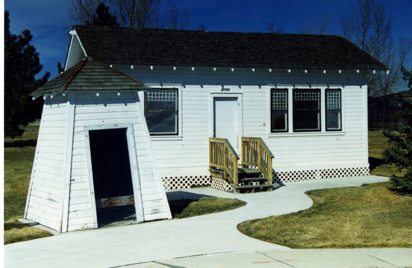 Exterior photo of Honey House and pump house at Zang Spur Park. No sign on Honey House.