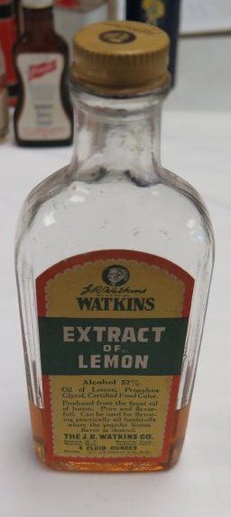 This is a clear glass bottle of Watkins Extract of Lemon with a yellow metal lid. The yellow sticker on the front of the bottle has a red border and green text that reads, "J.R. Watkins/ Watkins/ Extract/ of/ Lemon/ Alcohol 57%/ Oil of Lemon, Propylene/ Glycol, Certified Food Color./ Produced from the finest oil/ of lemon. Pure and flavor-/ full. Can be used for flavor-/ ing practically all foodstuffs/ where the popular lemon flavor is desired./ The J.R. Watkins Co./ Newark, N.J. Memphis, Tenn./ Winona, Minn. Oakland, Calif./ 4 fluid ounces/ FL1035 6104 Printed in USA". The bottle measures 6" (h) x 2.5" (w) x 1" (d).Collection