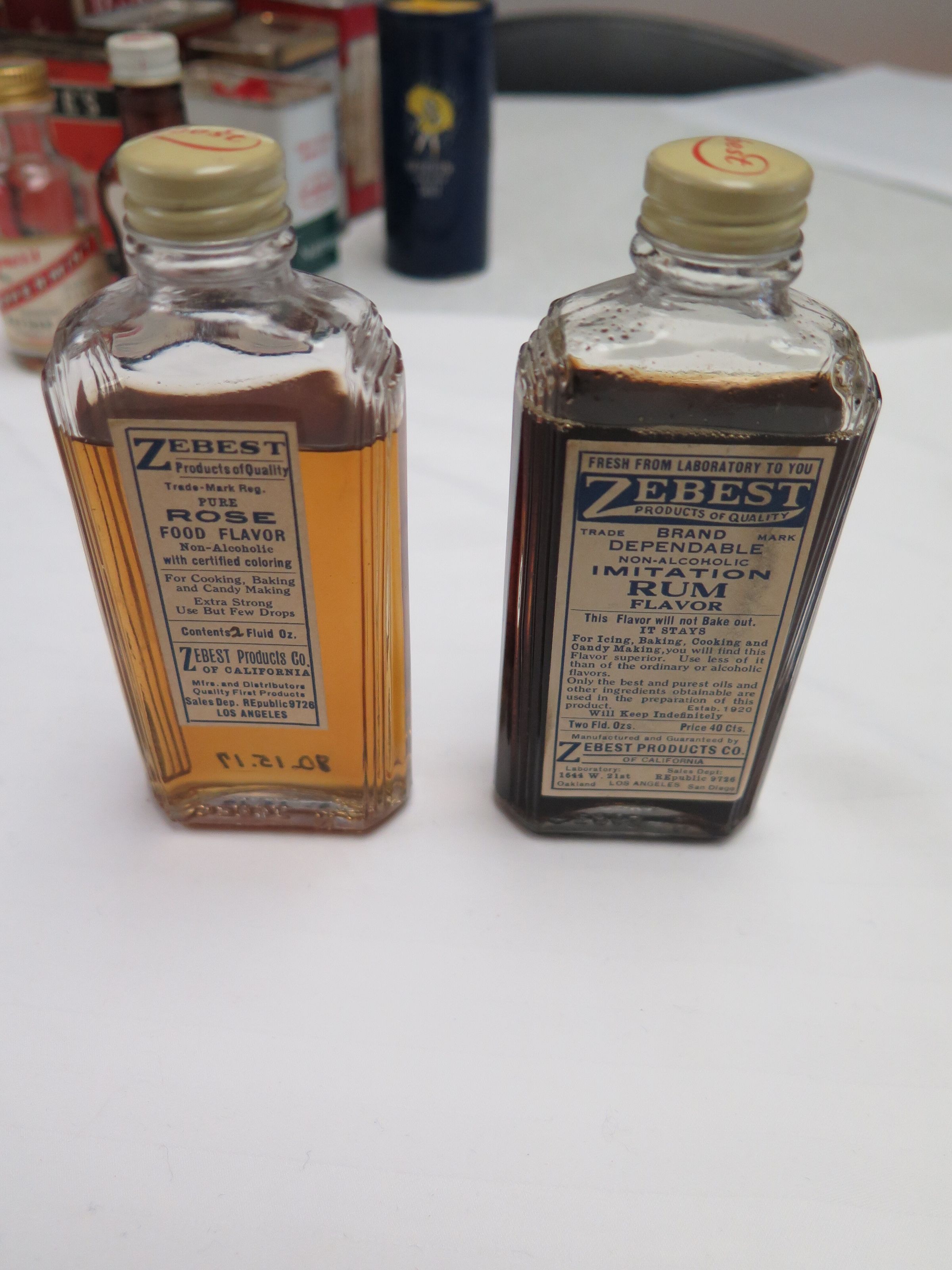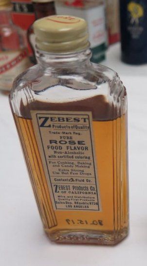 This is a glass bottle of Zebest Pure Rose Food flavor with a metal lid. The liquid inside the bottle is a yellow-orange color. The sticker on the front of the bottle is white with blue text that reads,"Zebest/Products of Quality/ Trade-Mark Reg./ Pure/ Rose/ Food Flavor/ Non-alcoholic/ with certified coloring/ For Cooking, Baking/ and Candy Making/ Extra Strong/ Use But Few Drops/ Contents 2 Fluid Oz./ Zebest Products Co./ Of California/ Mfrs. and Distributors/ Quality First Products/ Sales Dep. REpublic9726/ Los Angeles". The bottle measures 5" (h) x 2" (w) x 0.75" (d).Collection