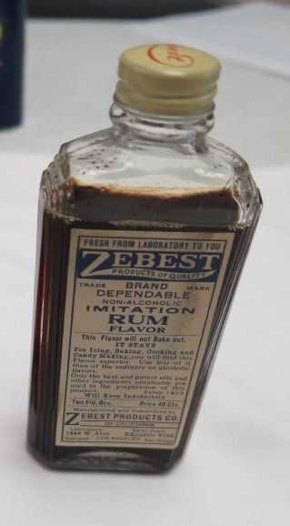This is a clear glass bottle of Zebest Imitation Rum Flavor with a metal lid. The bottle has a sticker on the front that is white with blue text that reads, "Fresh from Laboratory to you/ Zebest/ Products of Quality/ Trade Brand Mark/ Dependable/ Non-alcoholic/ Imitation/ Rum/ Flavor/ This Flavor will not bake out/ It stays/ For Icing, Baking, Cooking and/ Candy Making, you will find this/ Flavor superior. Use less of it/ than the ordinary or alcoholic/ flavors./ Only the best and purest oils and/ other ingredients obtainable are/ used in the prepreparation of this/ product. Estab. 1920/ Will keep indefinitely/ Two Fld. Ozs. Price 40 Cts./ Manufactured and Guaranteed by/ Zebest Products Co./ Of California/ Laboratory: Sales Dept.:/ 1644 W. 21st REpublic 9726/ Oakland Los Angeles San Diego". The bottle measures 5" (h) x 2" (w) x 0.75" (d).Collection