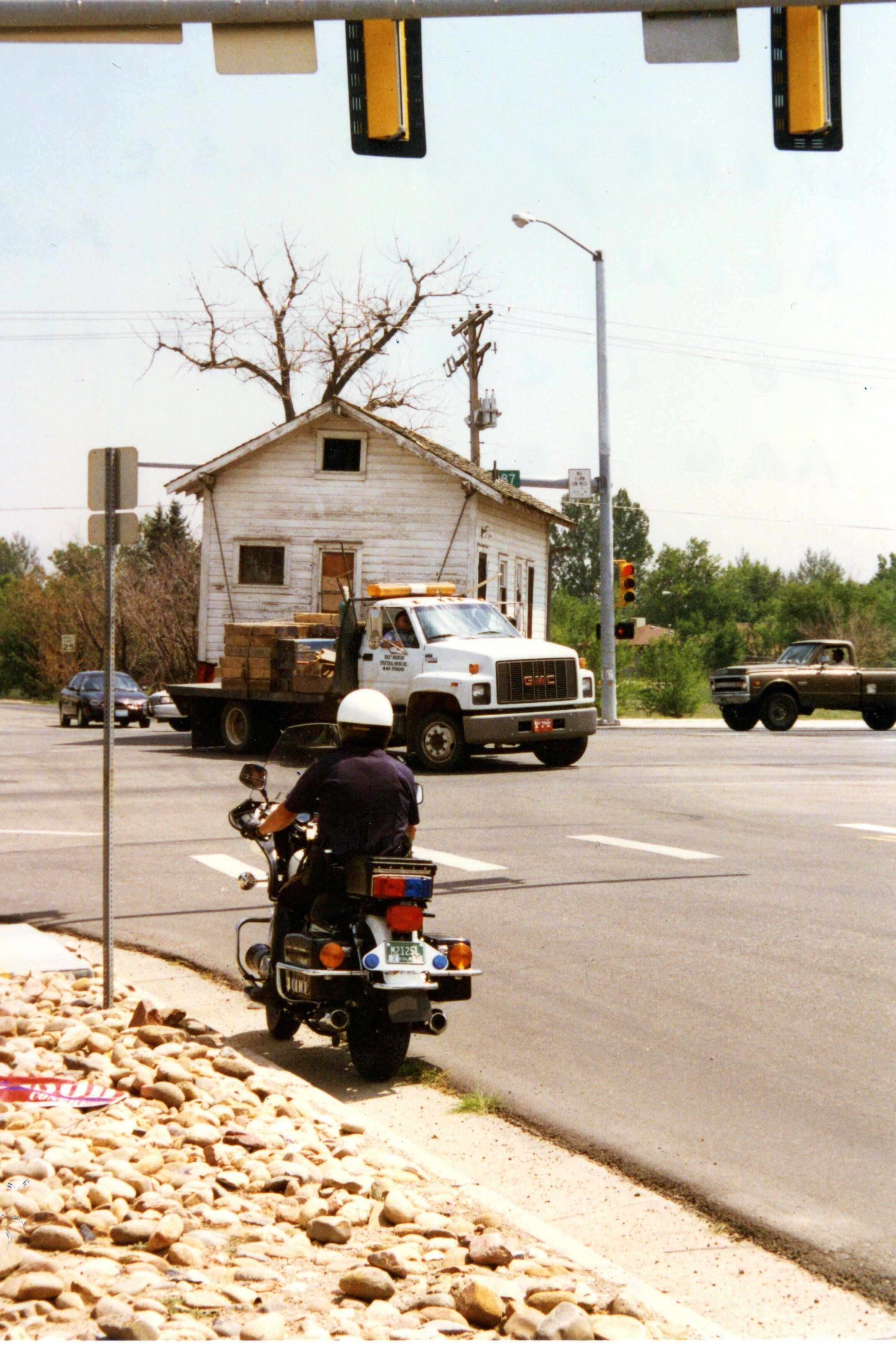 Photo of Miles Crawford Honey House being relocated to Depot Hill Museum. Zang Spur Park. Building on flatbed pulled by truck. Turning west onto 10th from Highway 287. Vehicles in road and policeman on motorcycle.