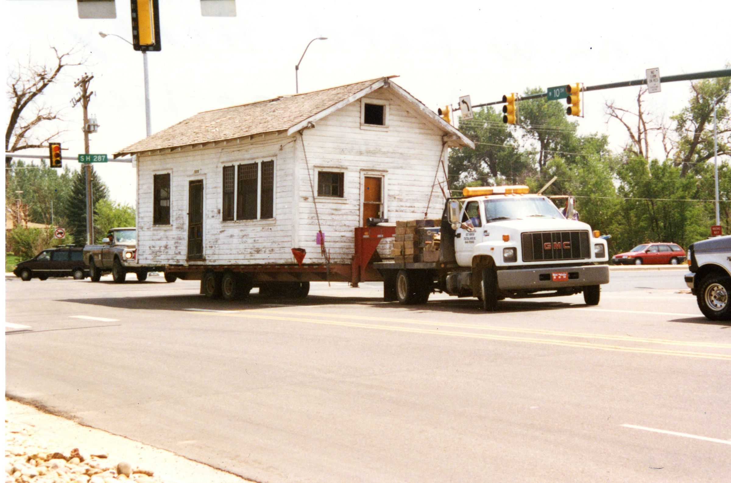 Photo of Miles Crawford Honey House being relocated to Depot Hill Museum. Zang Spur Park. Building on flatbed being towed by truck. Turning west onto Tenth from Highway 287. Other vehicles in road.