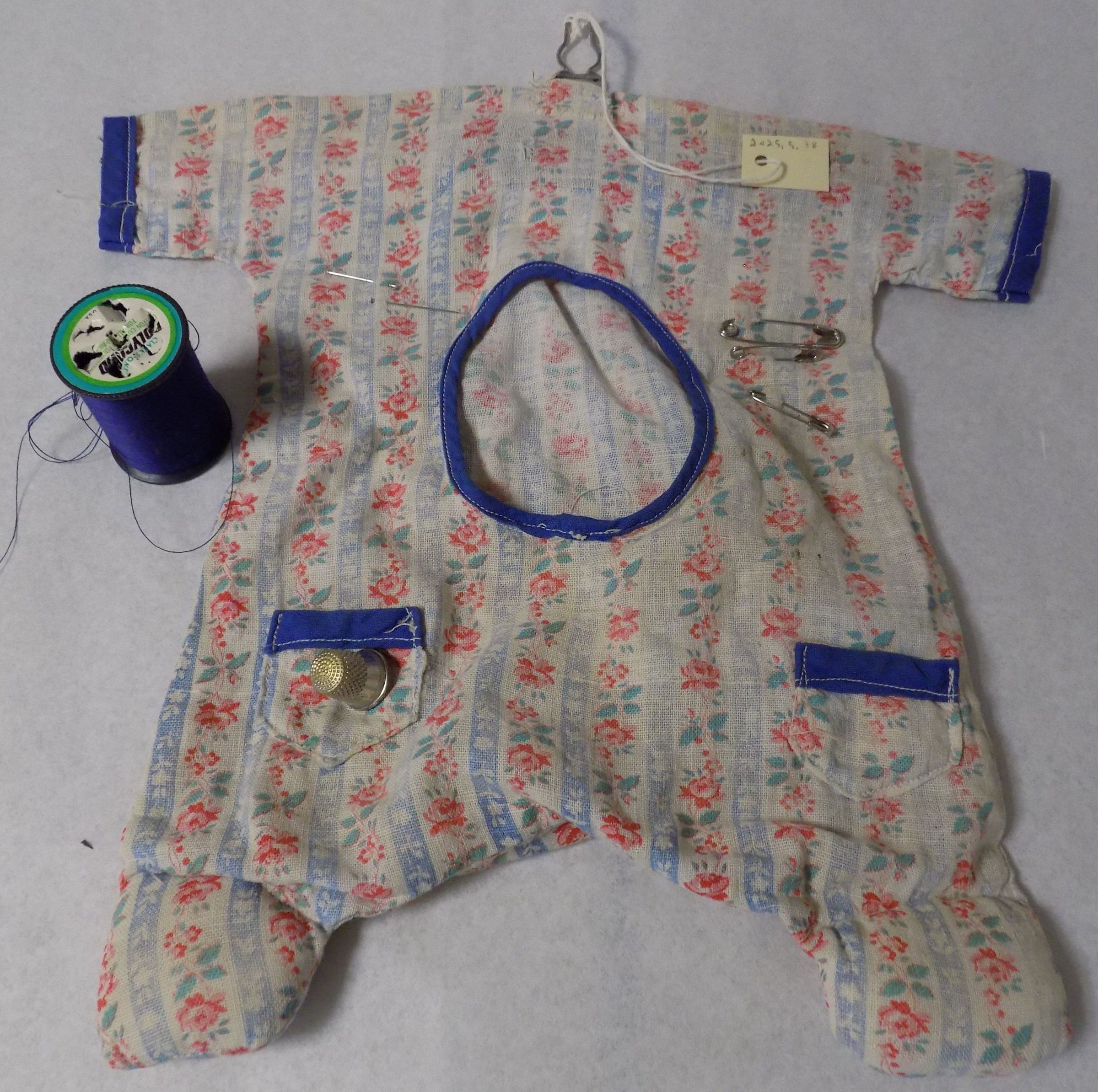 Item is a clothespin bag shaped like a baby onesie, likely from the 1970s. Clothespin bags were used for holding clothespins and had hooks so that they could be conveniently attached to a clothesline. The sleeves and pockets of the bag are surrounded by a dark blue border, and the rest of the fabric is light blue and patterned with roses. The back of the bag is much less faded than the front, and there is a metal hook sewn into the top. A few bobby pins and needles are tucked into the fabric, a thimble was found in the left pocket, and a roll of navy blue string is tucked into the main pouch, indicating that this clothespin bag was likely used as a sewing kit by its previous owner. A long piece of metal was sewn into the bag below the hook to keep it from folding in on itself while hanging.Collection