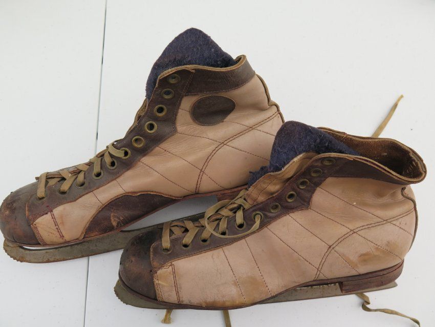 This is 1 pair of men's ice skates. The skates have a 2 tone brown upper and a metal blade. The skates measure 8.5" (h) x 12.25" (w) x 4" (d).