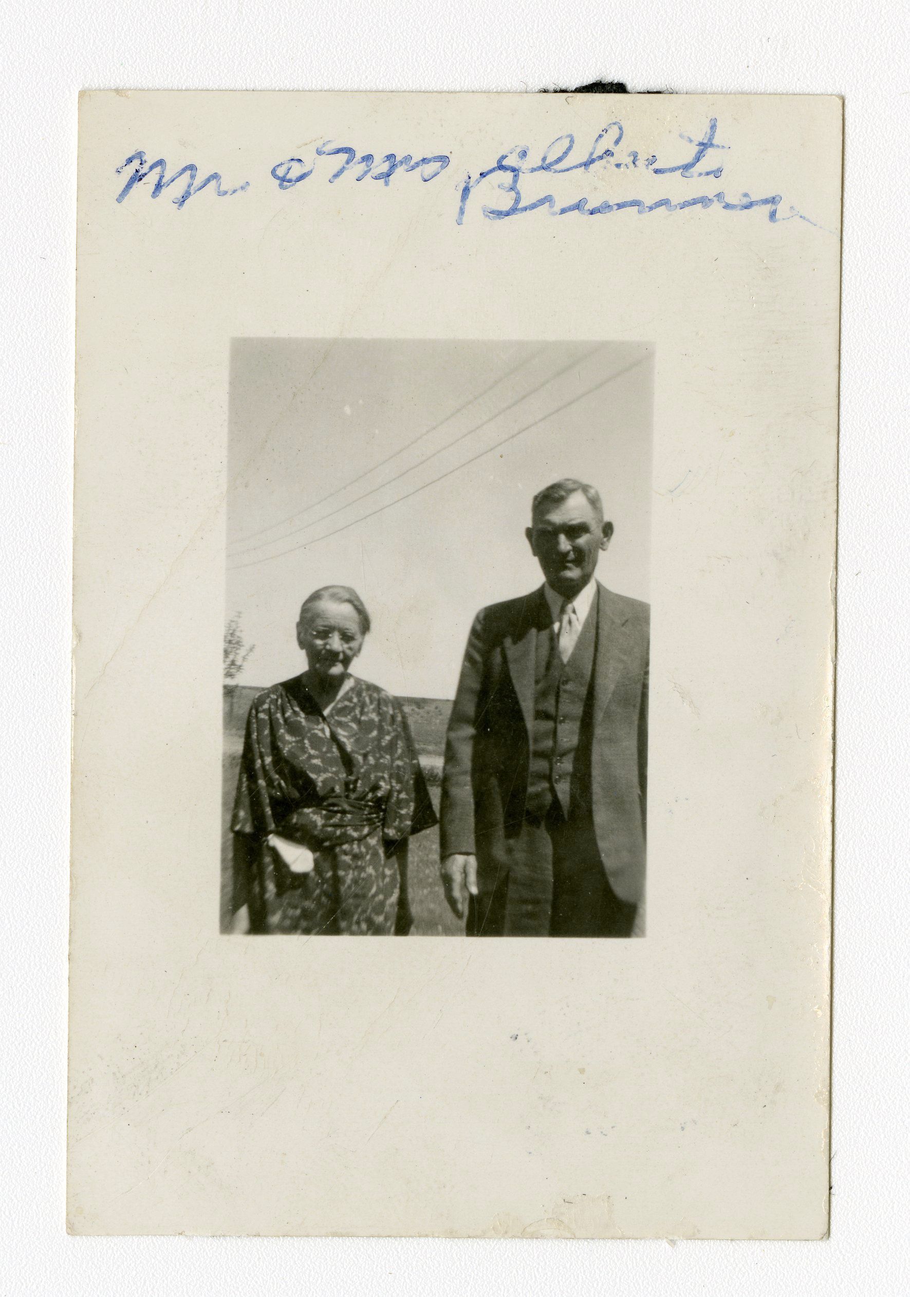 Black and white photograph of a man and a woman. The woman is on the left side of the image. Sher is wearing glasses and a patterned dress. The man is wearing a three piece suit. The photograph was taken outside. There is writing above the image. It reads "Mr. and Mrs. Albert Brunner. The man is Albert Brunner and the woman is Eliza Brunner.
