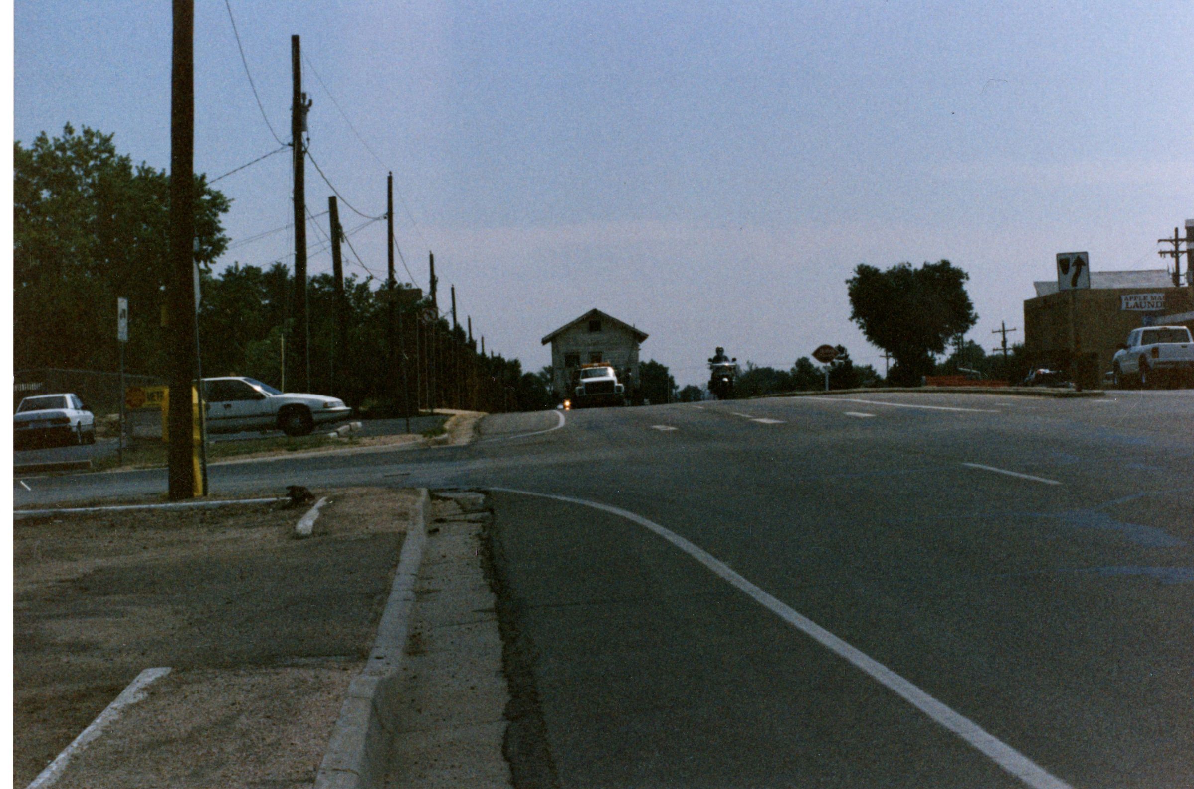 Photo of Miles Crawford Honey House being relocated to Depot Hill Museum. Zang Spur Park. Building on flatbed being towed northbound on Highway 287 towards intersection. Motorcycle policeman leading.