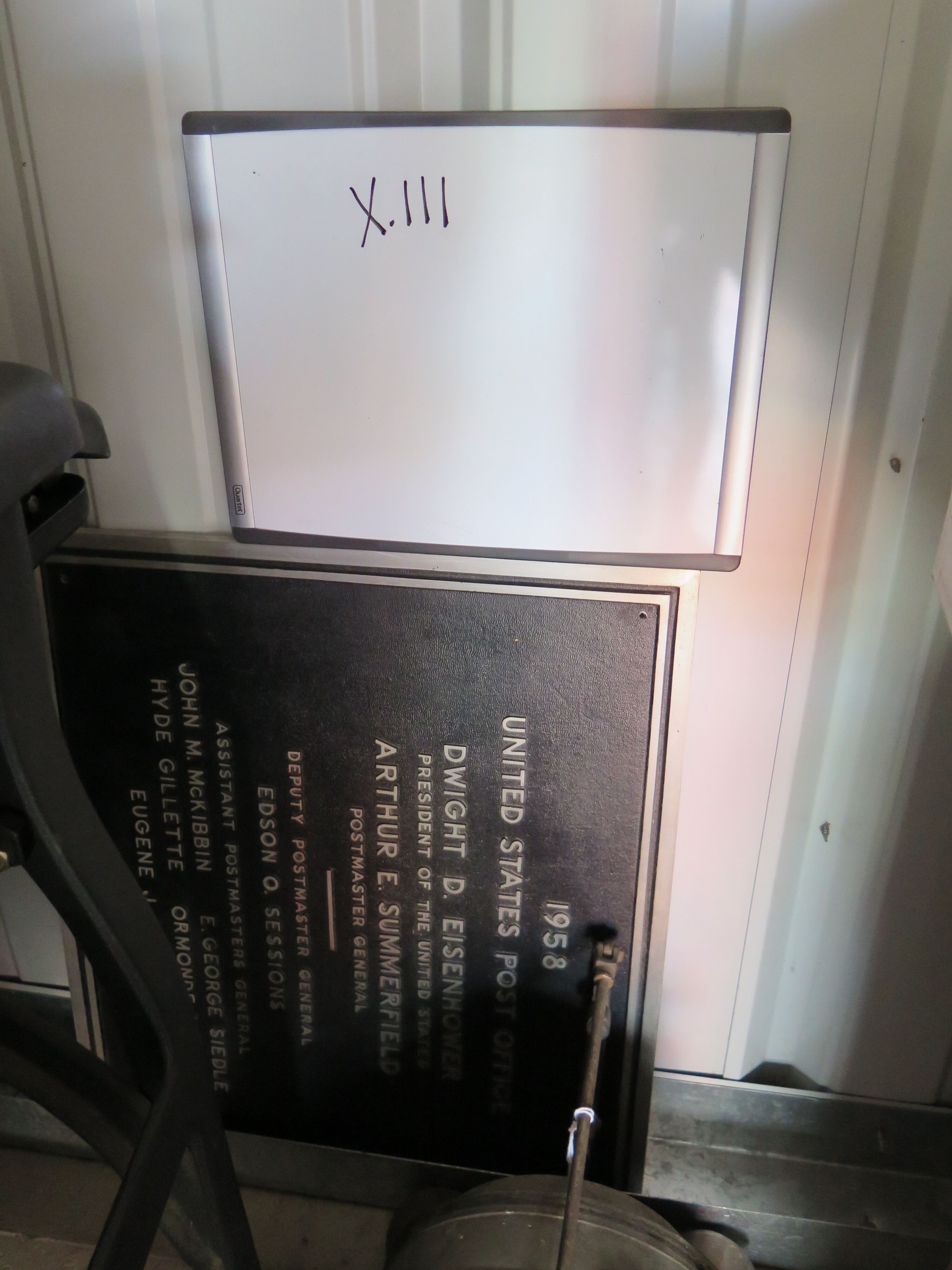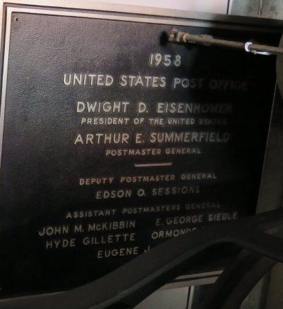 This plaque is 24"(l) x 20"(w). It is from the post office building at 1380 Midway which was built in 1958. It is black with white raised lettering.