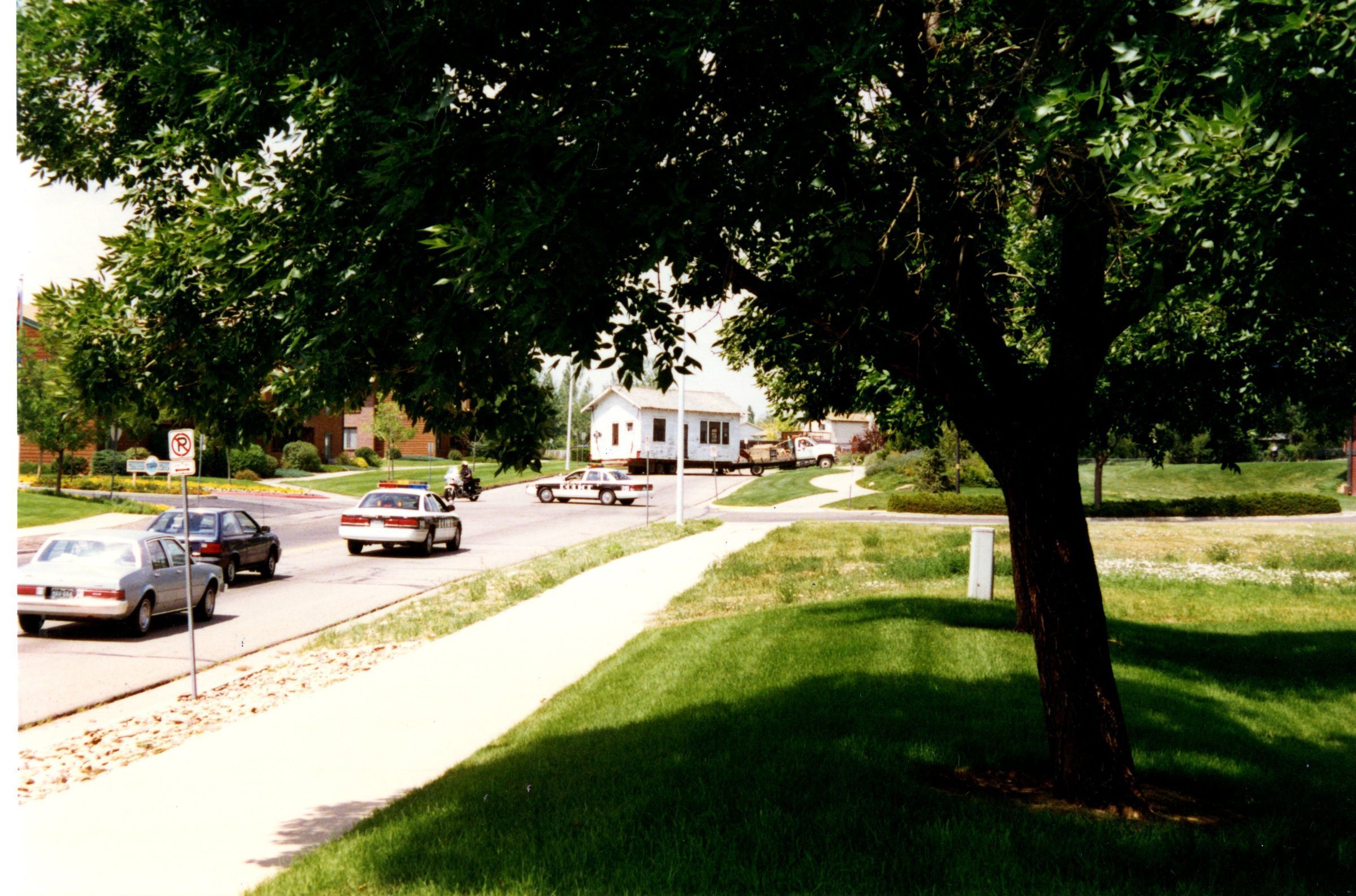 Photo of Miles Crawford Honey House being relocated to Depot Hill Museum. Zang Hill Park. Building on flatbed being towed by truck turning into park. Two police vehicles and motorcycle officer. Traffic backed up.