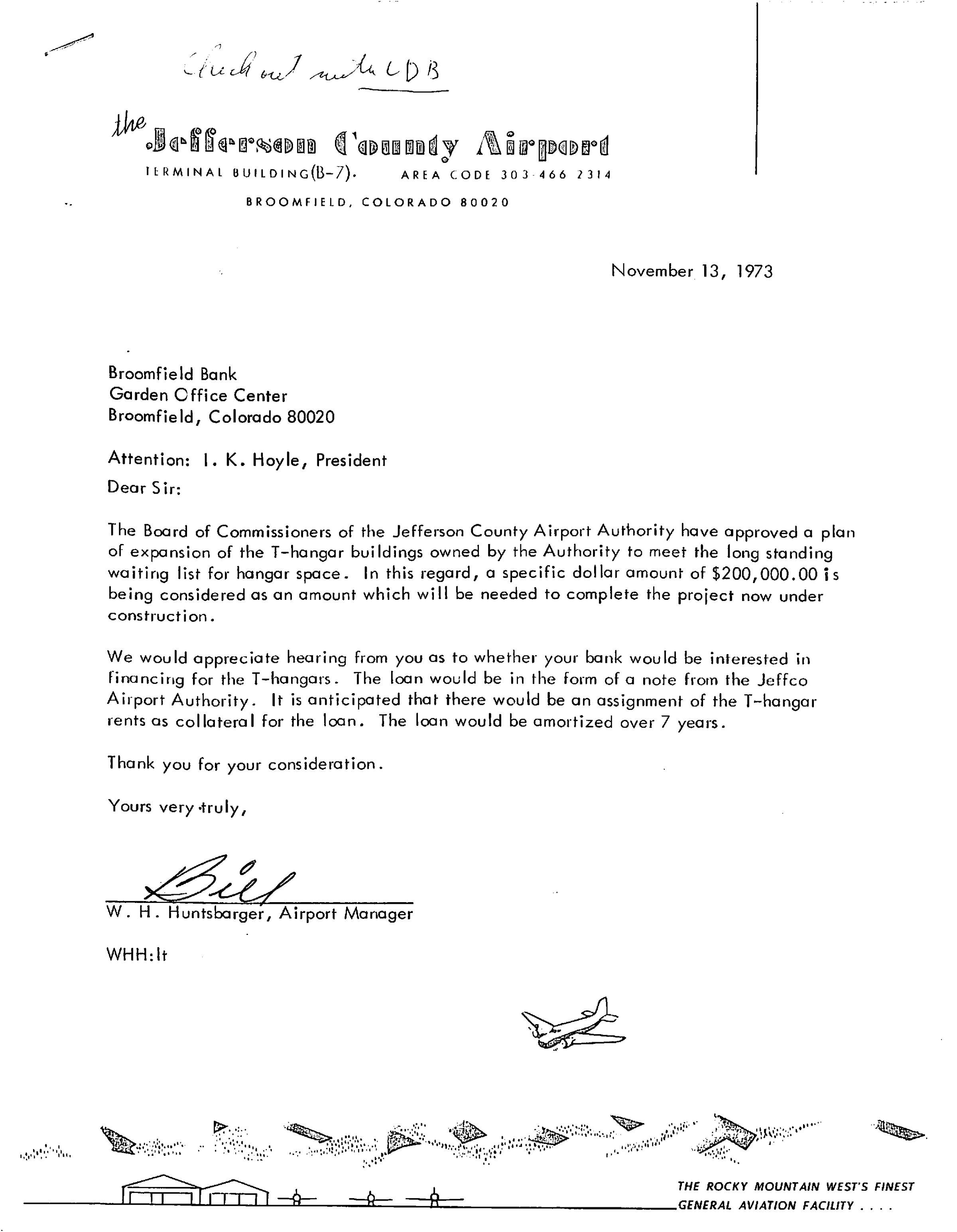 Item is a letter from the Jefferson County Airport to the Broomfield Bank. Letter is printed on a white sheet of paper, and at the top, general information (location, phone number, etc.) about the Airport is included. The letter was written on November 13, 1973 by W.H. Huntsbarger, the Airport Manager. Huntsbarger wrote in order to see if the Broomfield Bank would be willing to loan the Airport $200,000 dollars for the expansion of the T-hangars. At the bottom of this first letter, there is a small printed drawing of an airplane landing at the base of a mountain range. Stapled to the first letter is a second letter, printed on yellow paper. This letter was written on November 16, 1973 by I.K. Hoyle, the President of Broomfield Bank. It was written in order to inform Huntsbarger that the bank would not be able to loan them the money.Collection