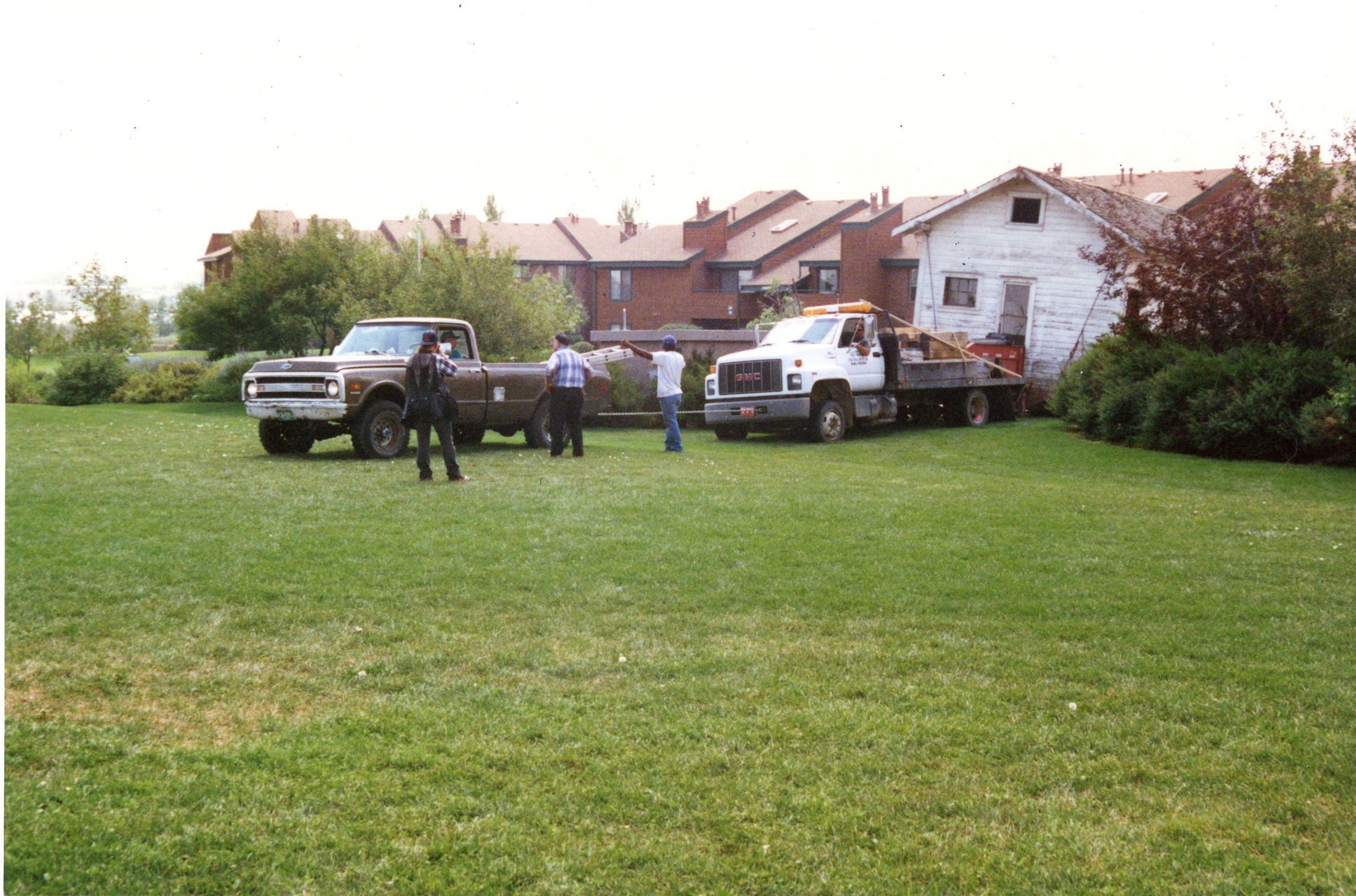 Photo of Miles Crawford Honey House being relocated to Depot Hill Museum. Zang Spur Park. Building on flatbed being towed onto grass in park. Another vehicle in front with tow strap attached to truck pulling flatbed. Men discussing situation.