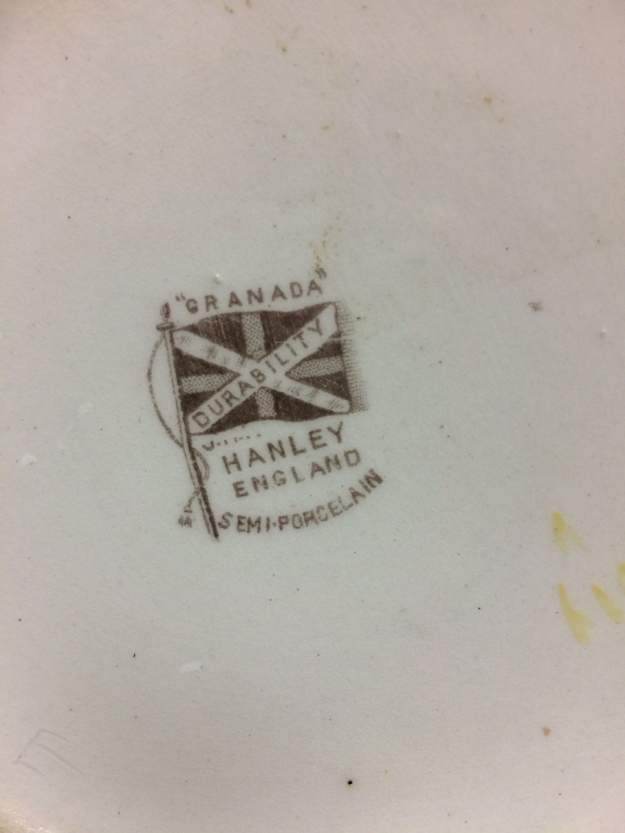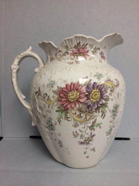 This is a 11" tall wash pitcher with a 8 1/2" diameter. The white pitcher has a floral design, "Granada," with leaves and scrolls. The edges are scolloped. Makers mark on the bottom reads "Granada" Durability Hanley England Semi-Porcelain.