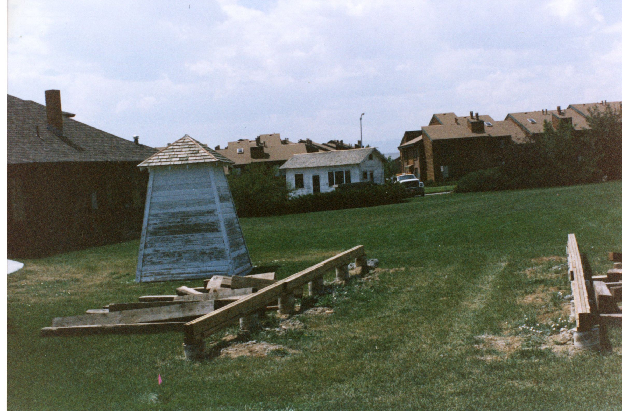 Photo of Miles Crawford Honey House being relocated to Depot Hill Museum. Zang Spur Park. Building on flatbed being towed by truck onto grass in park. Cedar Crest apartments in background. Pump house, Depot museum and temporary foundation of concrete and wood for Honey House in foreground.