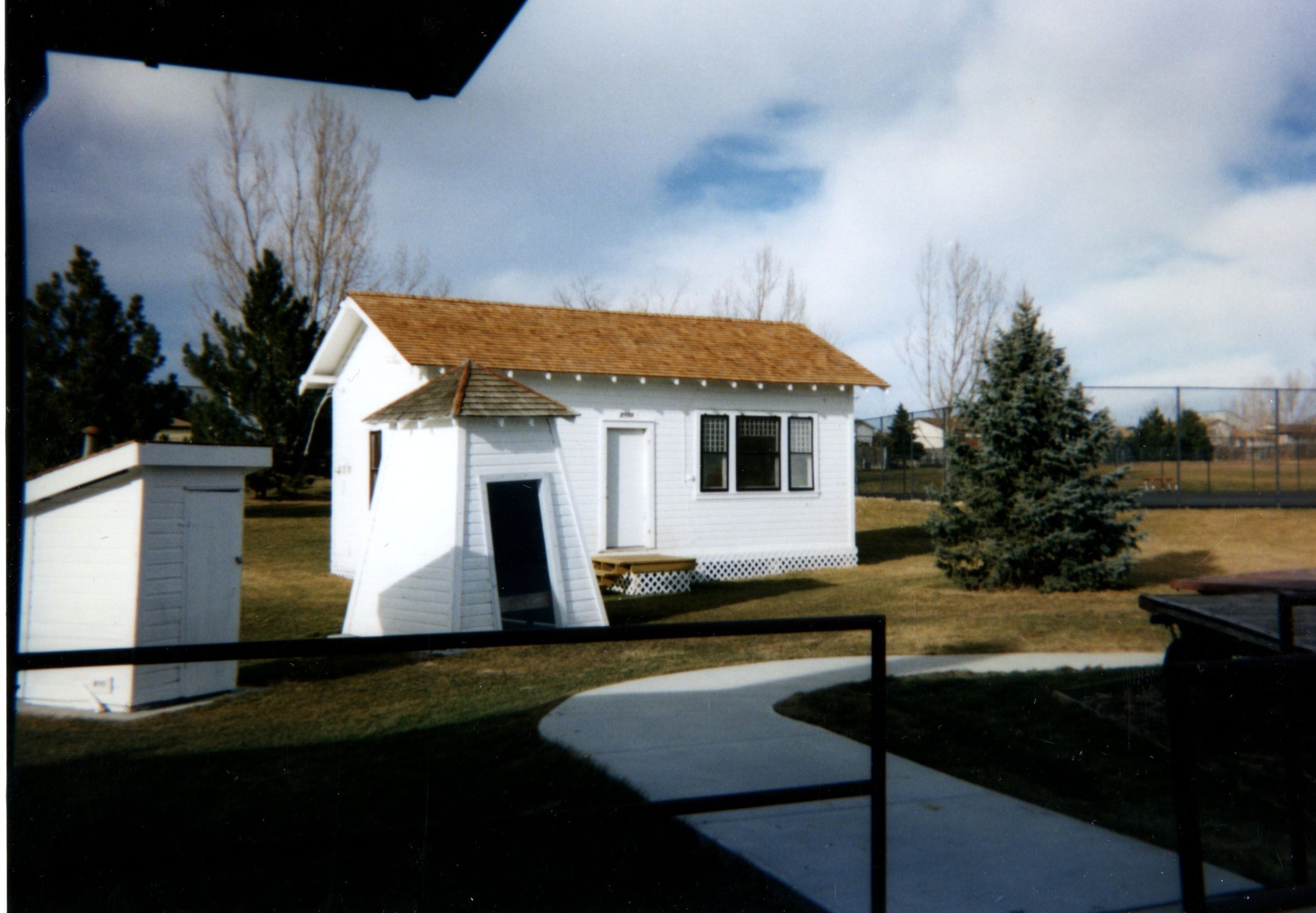 Photo of Honey House, Pump House and Outhouse at Zang Spur Park. Tennis courts in background.