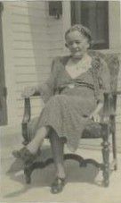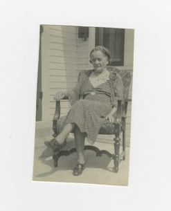 Black and white photograph of a woman sitting in a wooden chair outside a house