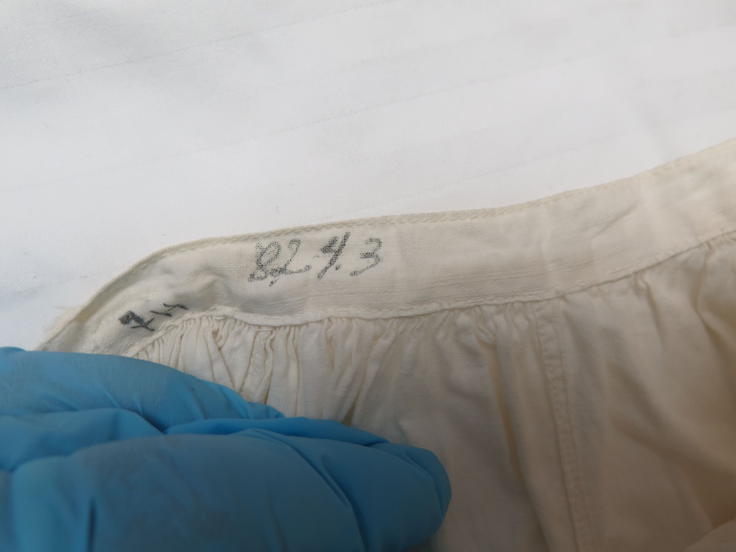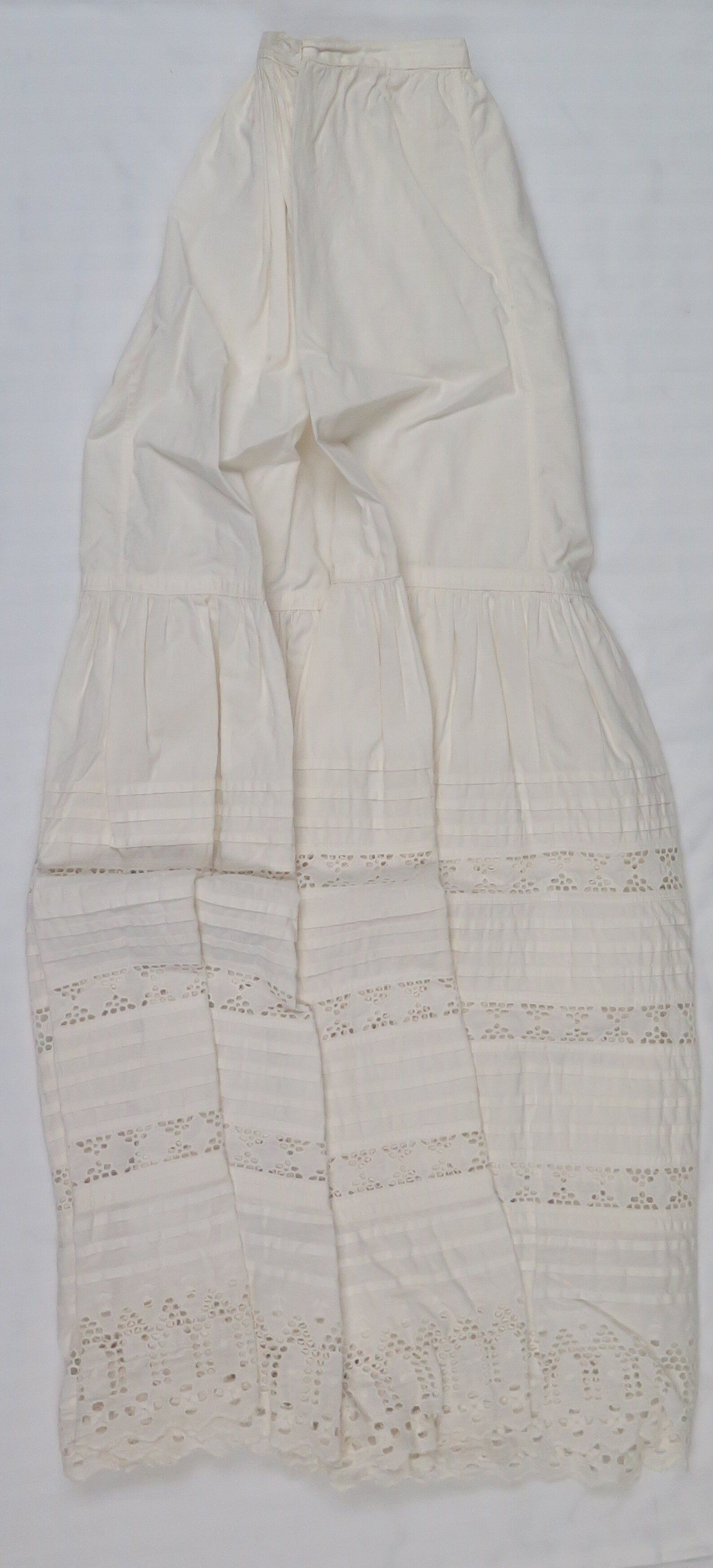 This is a white cotton slip skirt that was part of wedding ensemble. The slip has eyelets near the bottom. The skirt measures 34" (l) x 10" (dia).
