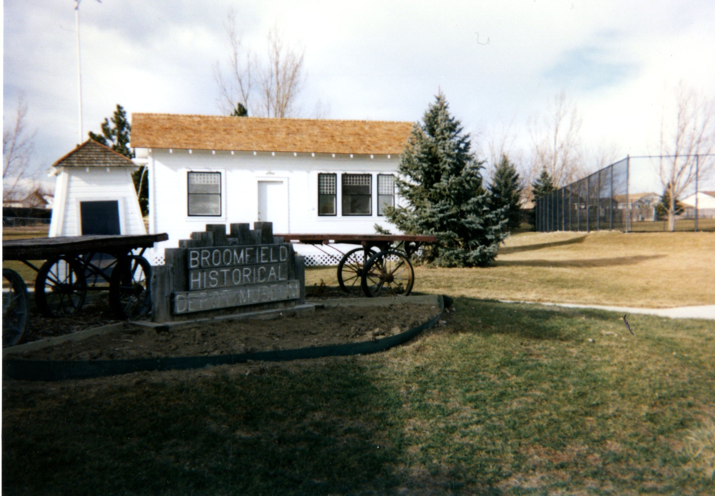 Photo of Honey House and Pump House at Zang Spur Park. Two railroad luggage carts. Sign "Broomfield Historical Depot Museum". Tennis courts in background.